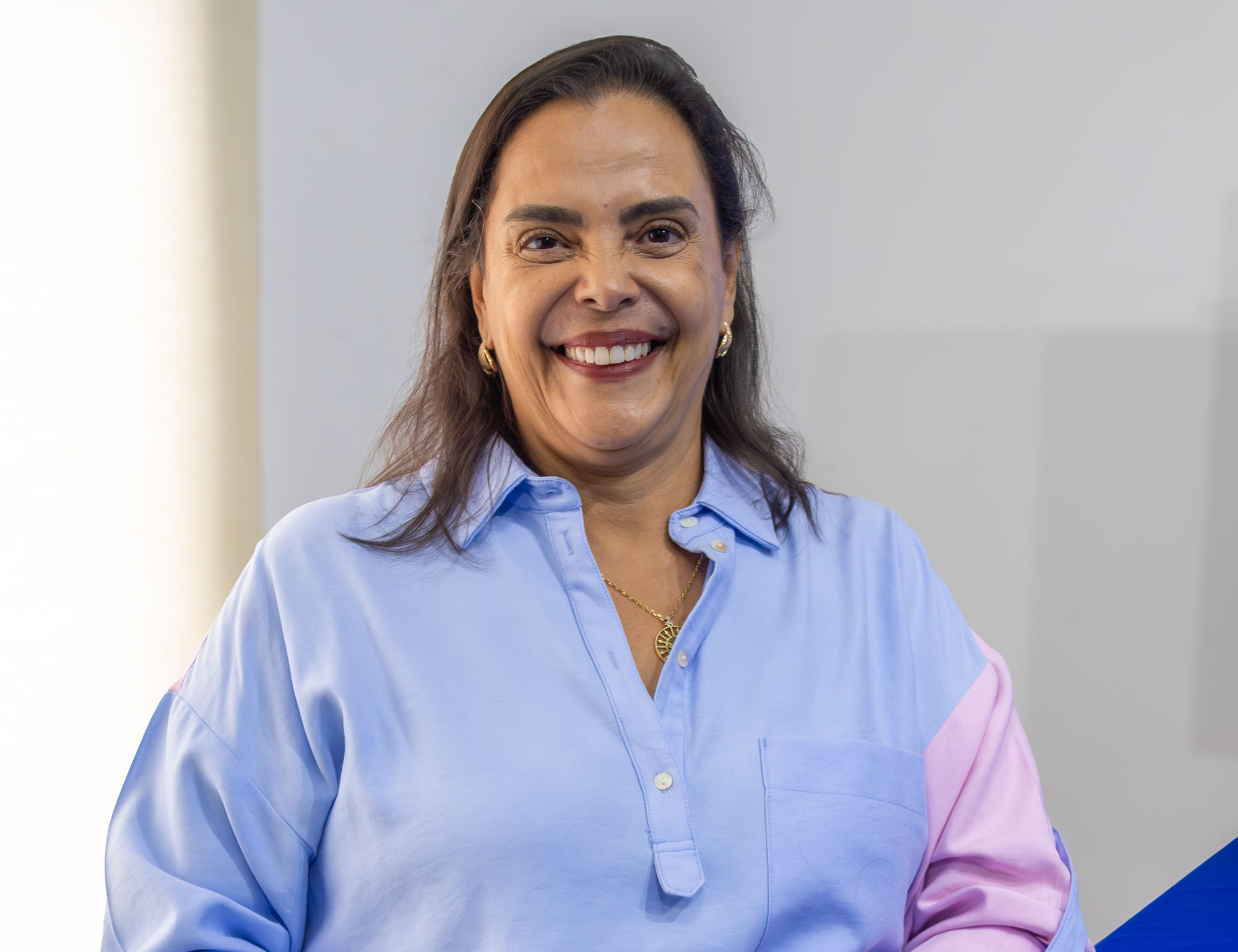 #PraTodosVerem: As imagens mostram um ambiente de gravação do projeto ‘Fala, Estudante!’, com um monitor ao fundo exibindo a logo oficial. Na primeira foto, três pessoas estão sentadas ao redor de uma mesa azul: Marta Braz, a secretária de educação, que veste uma camisa azul e rosa e sorri calorosamente à esquerda, ao lado de duas adolescentes participantes. O monitor central detalha o brasão da Prefeitura de São Sebastião e da Seduc. A segunda imagem foca em um close-up de Marta Braz, sentada à mesa com as mãos cruzadas, transmitindo uma expressão profissional e acolhedora no estúdio de paredes brancas. Fim da descrição.