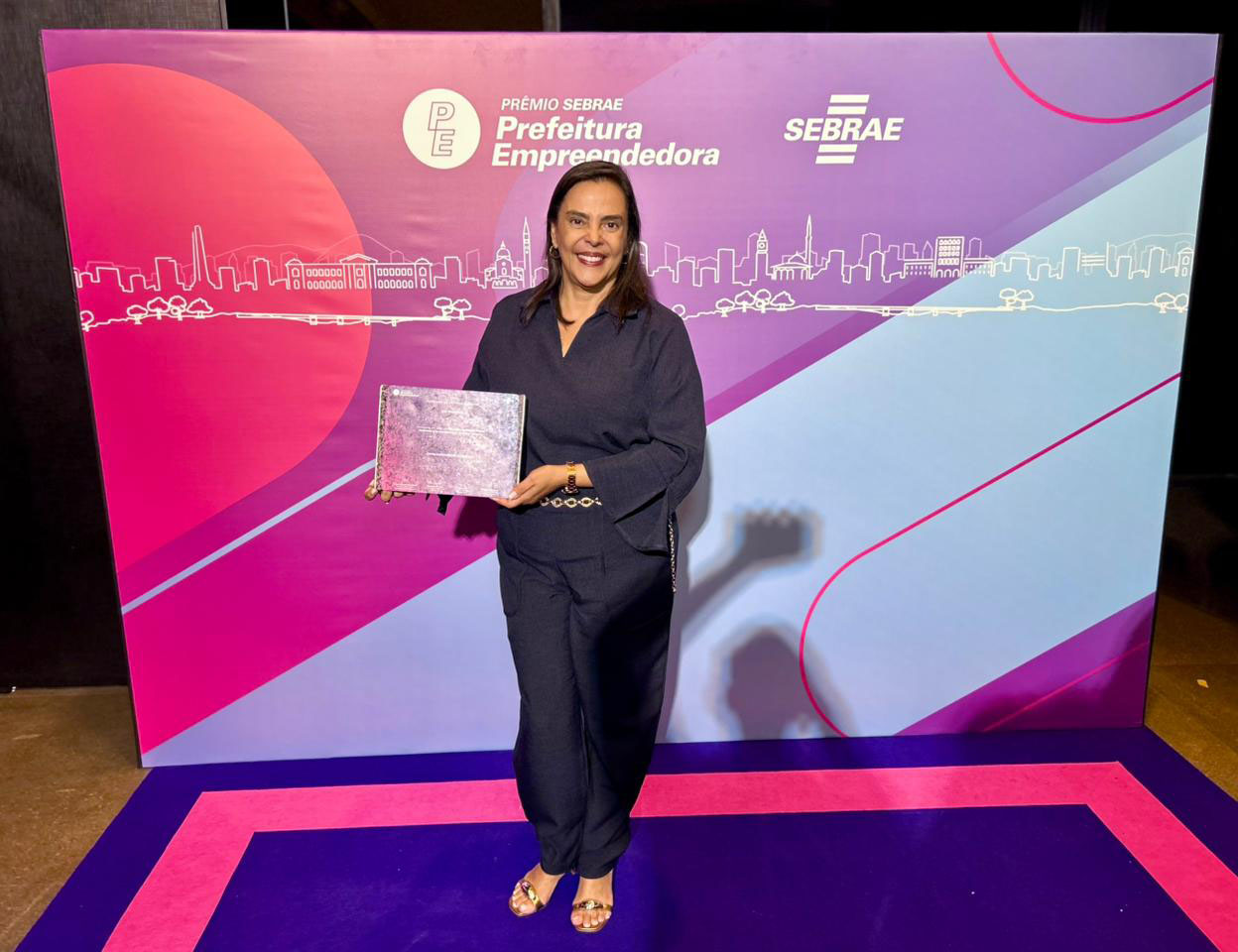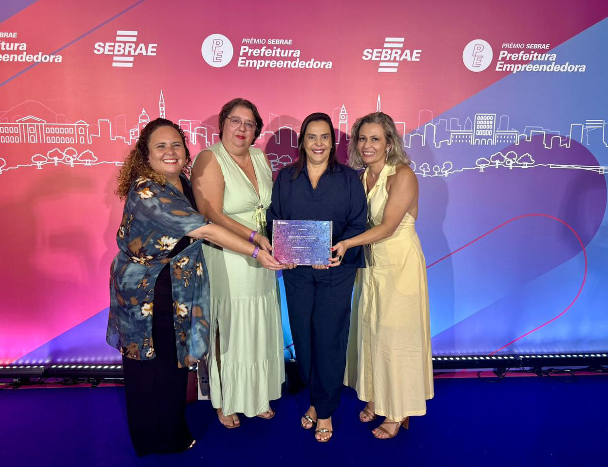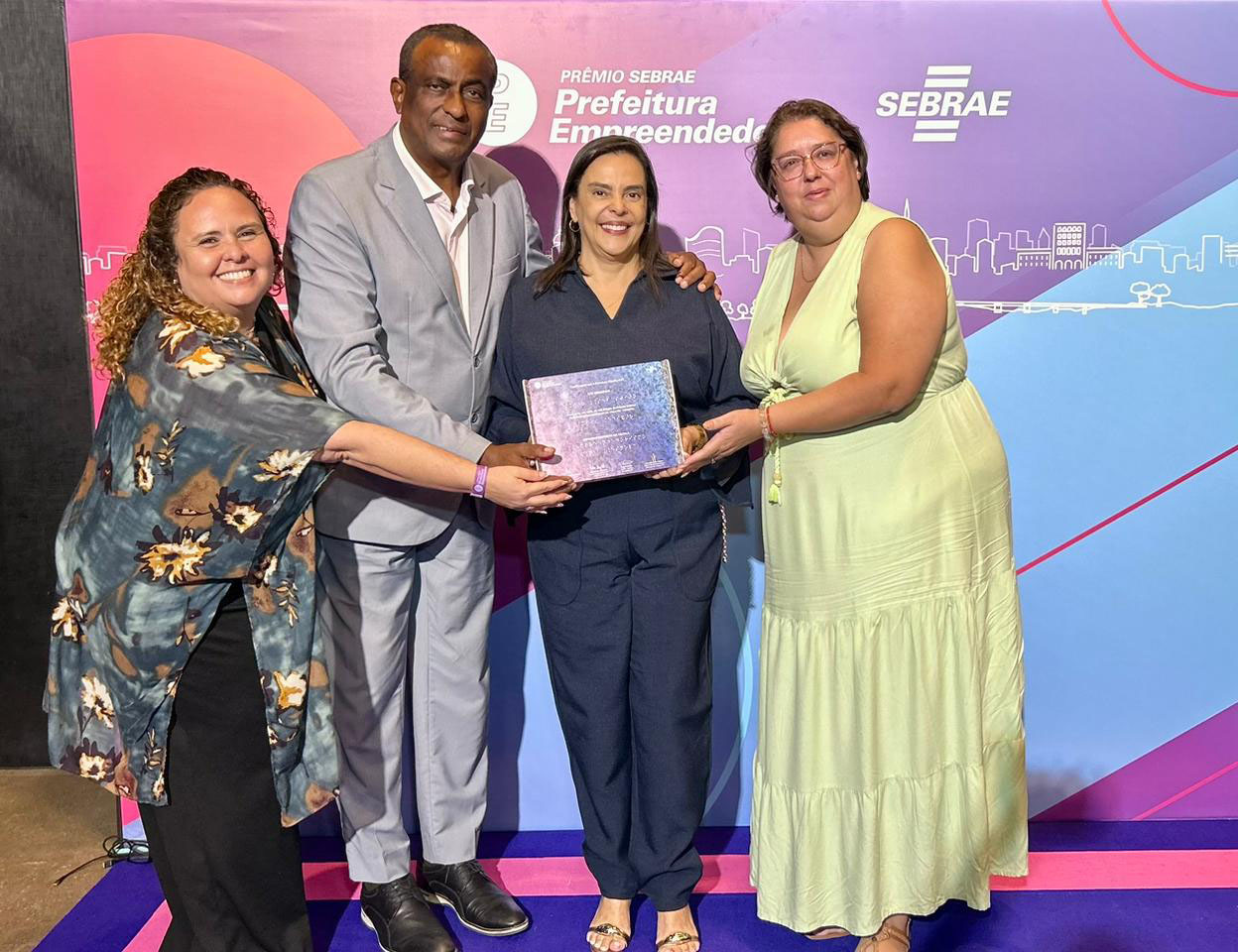 #PraTodosVerem: As três imagens registram a entrega do reconhecimento Sebrae Prefeitura Empreendedora, apresentando pessoas sorridentes em frente a um painel vibrante com degradê de rosa, roxo e azul, decorado com o desenho de uma linha do horizonte urbana. Em todas as fotos, uma mulher de macacão azul marinho é o destaque central, segurando uma placa de premiação retangular e brilhante. Na primeira imagem, ela aparece sozinha; na segunda, está acompanhada por um homem de terno cinza e duas mulheres; e na terceira, posa ao lado de três mulheres que também tocam o prêmio, simbolizando uma conquista coletiva em um ambiente de celebração e evento formal. Fim da descrição.