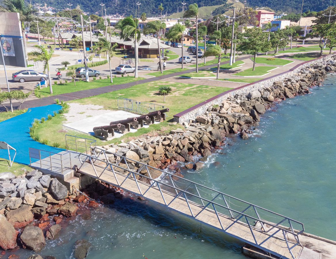 #PraTodosVerem: Imagens aéreas mostram orla com píer, no Complexo Turístico da Rua da Praia, Centro de São Sebastião, área verde, caminhos e estruturas de lazer à beira-mar, com mar calmo e paisagem urbana ao fundo. Fim da descrição.