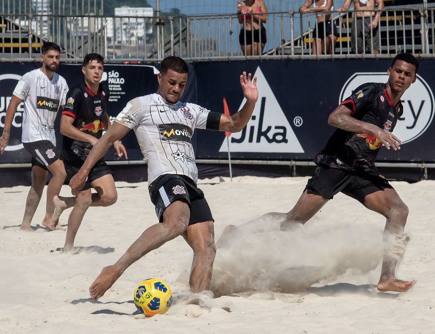 #PraTodosVerem: As imagens registram momentos dinâmicos do Campeonato Paulista de Beach Soccer, destacando a intensidade e a plasticidade do esporte na areia. O foco das cenas é de ação, com atletas vestindo camisas do Corinthians e do Red Bull em disputas acirradas pela bola amarela, incluindo um salto acrobático de bicicleta que levanta uma grande cortina de areia clara. O cenário é composto por redes de proteção, bandeiras publicitárias e o público ao fundo, capturando a energia de um evento esportivo oficial realizado em uma arena à beira-mar. Fim da descrição.