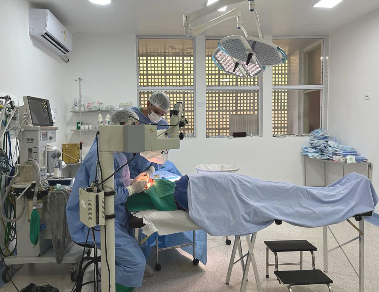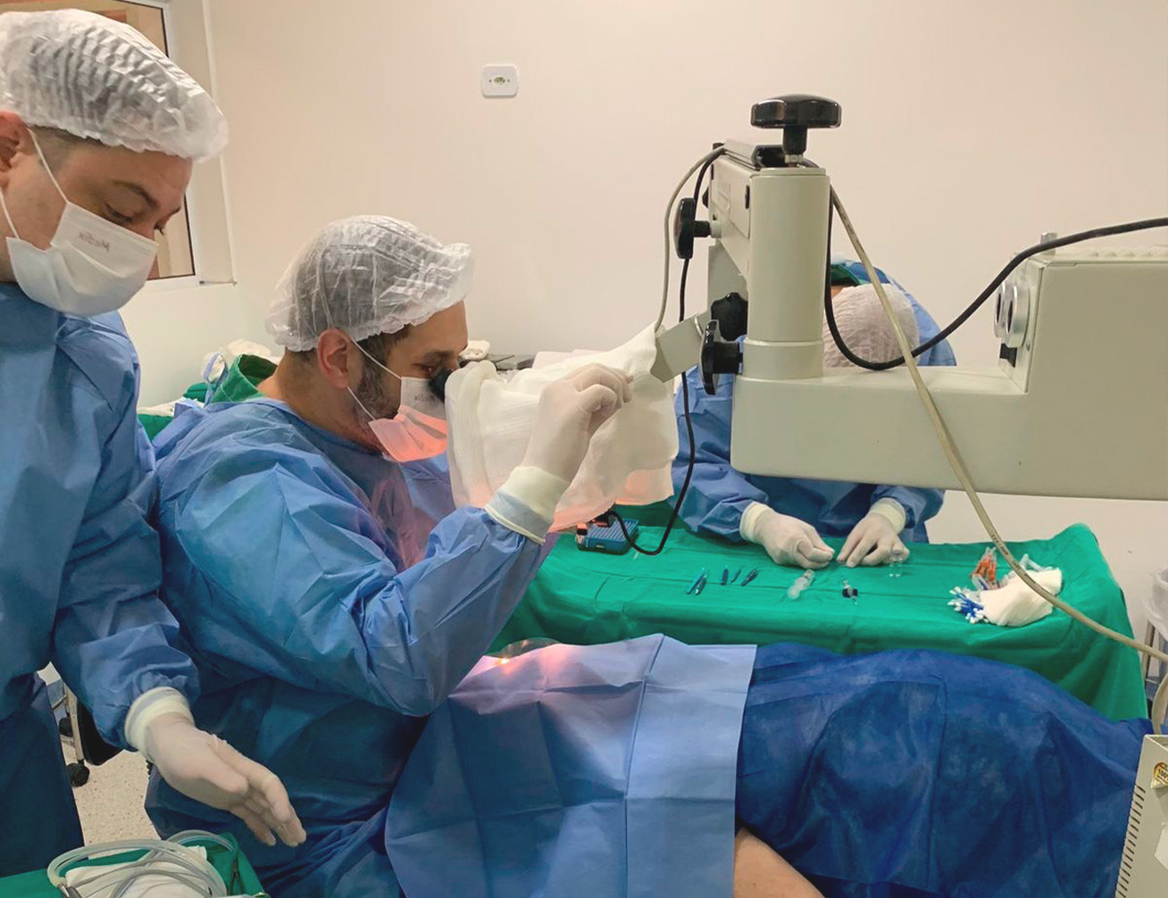 #PraTodosVerem: Equipe de médicos estão em preparativos para cirurgia de olhos, com um analisando paciente, outra instrumentos. Outra imagem mostra a cirurgia dentro de uma quarto hospitalar. Fim da descrição.