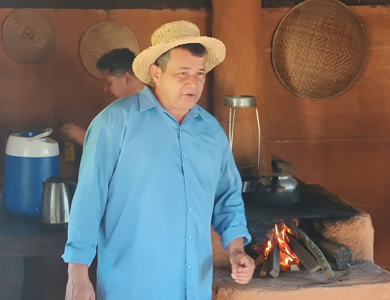 #PraTodosVerem: Sequência de imagens mostra um homem de chapéu de palha e camisa azul apresentando a cultura caiçara. Ele segura um cesto de vime com imagens religiosas e apetrechos de pesca diante do mar, fala para um grupo de turistas dentro de uma casa de pau a pique com fogão a lenha e orienta crianças que interagem com elementos culturais em uma praça. Fim da descrição.