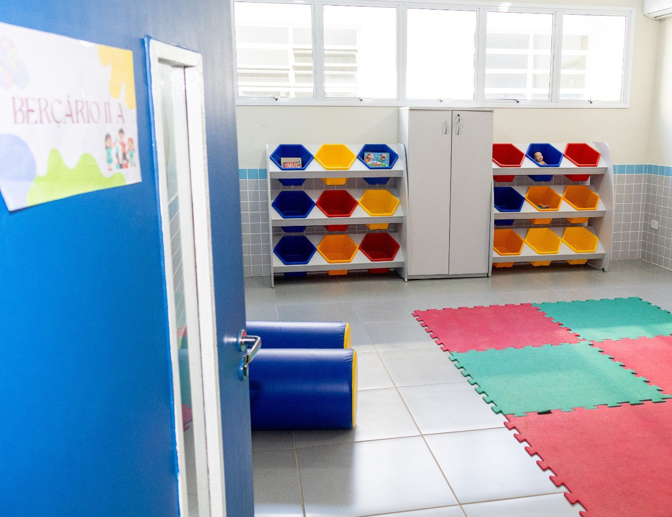 #PraTodosVerem: Conjunto de quatro fotos de uma creche escolar, destacando uma menina sorridente sentada à mesa e ambientes internos amplos, organizados e coloridos. As salas de aula e o berçário possuem mesas brancas com cadeiras amarelas, estantes com nichos coloridos e pisos emborrachados, enquanto o refeitório exibe painéis vibrantes de frutas como bananas, maçãs e laranjas. A estrutura é moderna, com paredes de azulejos claros e detalhes em azul, transmitindo um clima acolhedor de aprendizado e cuidado infantil. Fim da descrição.