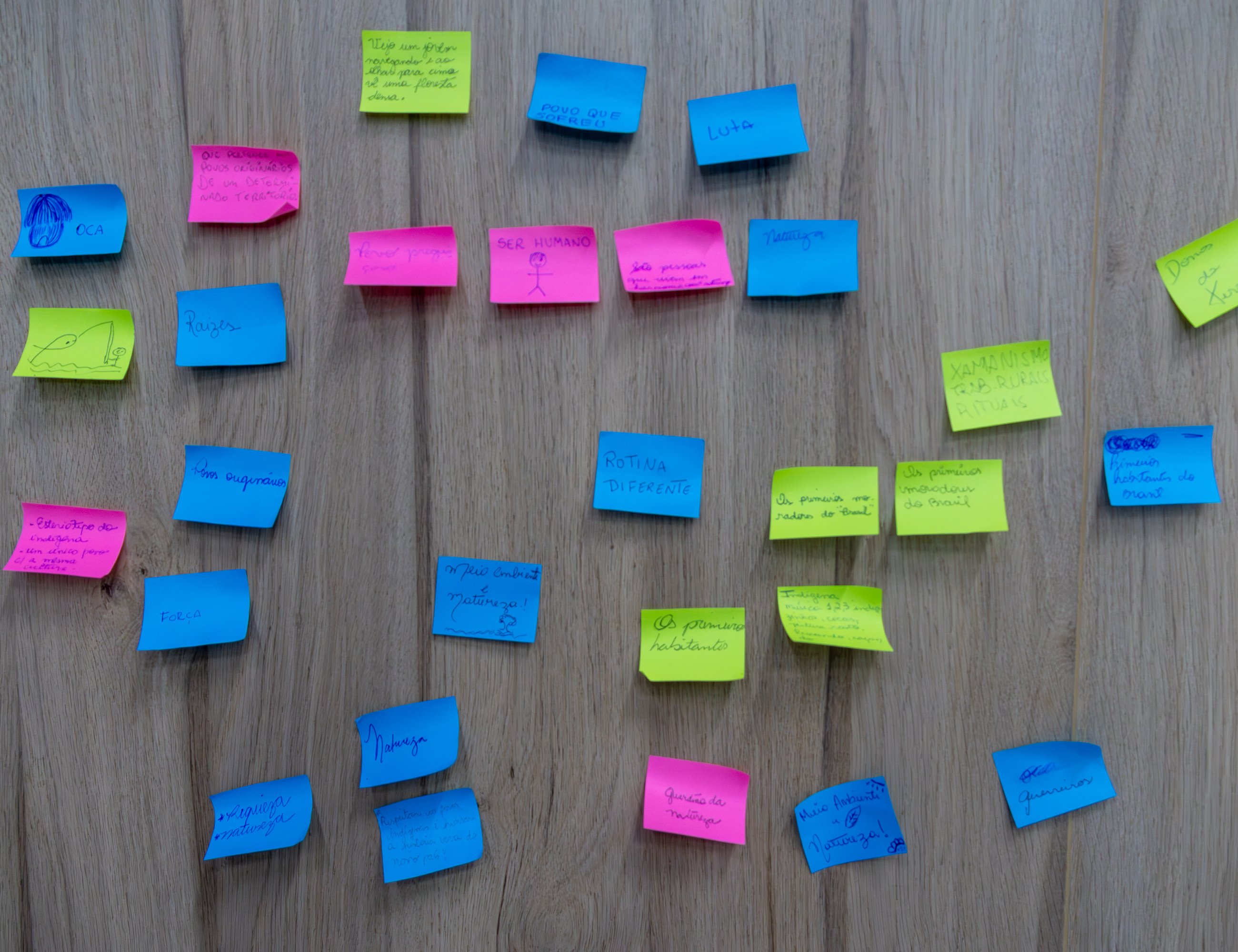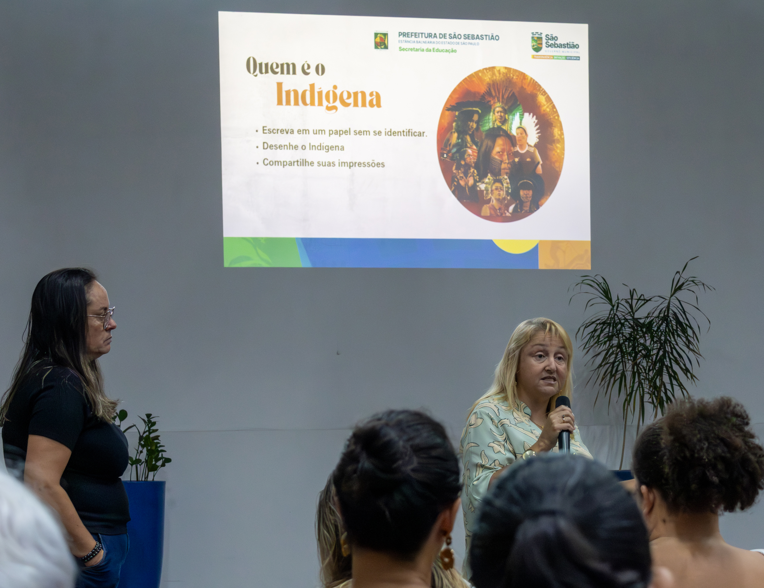 #ParaTodosVerem: As imagens mostram uma formação pedagógica em São Sebastião sobre a temática indígena e a Lei 11.645/08. Em um auditório, uma plateia assiste a palestras ministradas por educadores e um homem indígena com cocar, acompanhando projeções que discutem identidade e valorização cultural. O evento inclui uma dinâmica participativa onde os presentes registraram suas impressões em post-its coloridos, fixados em um painel de madeira com palavras como Natureza, Luta e Raízes, simbolizando a construção coletiva do conhecimento sobre os povos originários.