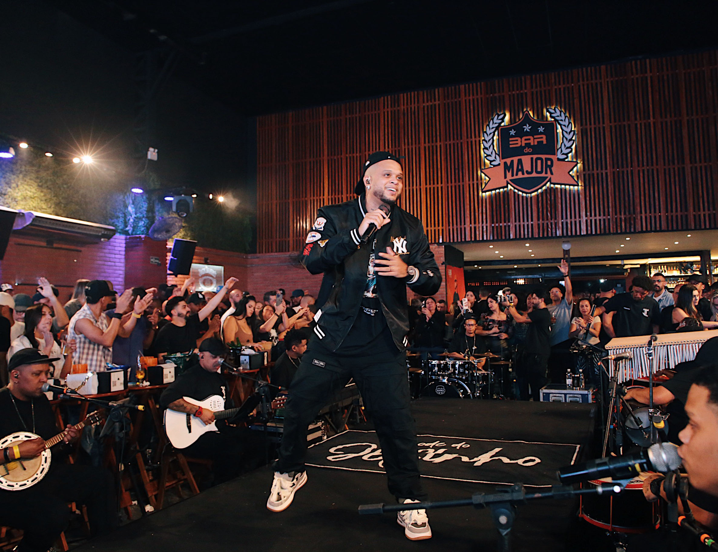 #PraTodosVerem: Sequência de fotos de apresentações musicais. Imagem do cantor se apresentando em um palco 360 dentro de um bar cheio, com público ao redor e músicos tocando. Imagem do cantor em destaque no palco, segurando microfone e cantando sob luzes azuis. Imagem de apresentação ao ar livre do projeto SSambinha, com banda no palco montado próximo à praia, árvores ao redor e plateia acompanhando o show. Fim da descrição.