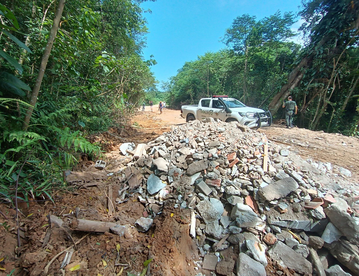 #PraTodosVerem: Em uma rua de terra, agentes da Prefeitura de São Sebastião e da Polícia Ambiental realizam fiscalização contra ocupações irregulares. As imagens mostram área de Mata Atlântica impactada por descarte irregular de entulho e movimentação de terra, com restos de madeira, concreto, tijolos, plásticos e outros resíduos da construção civil espalhados no local. Também é possível observar uma estrada de terra aberta em meio à vegetação. Fim da descrição