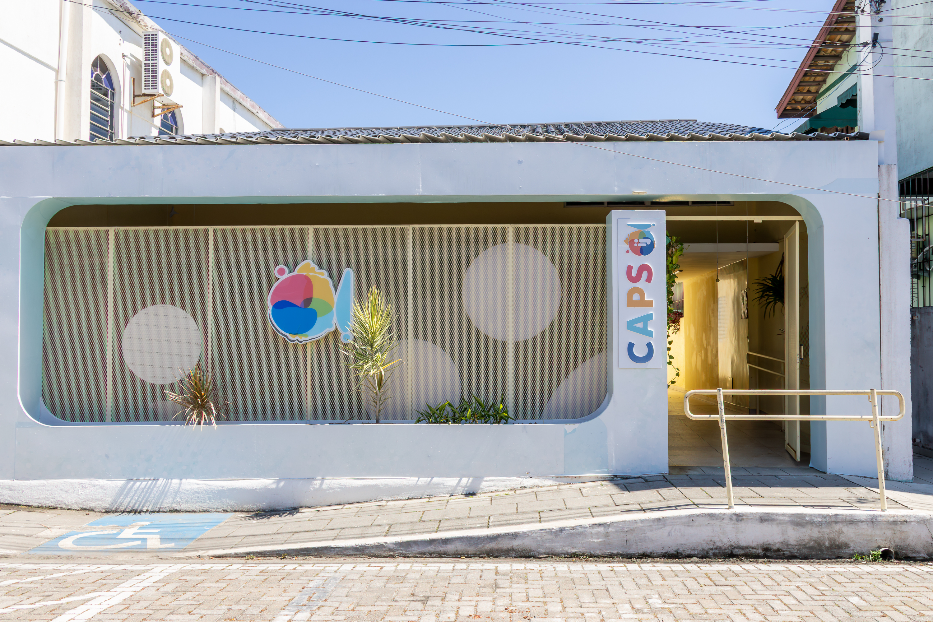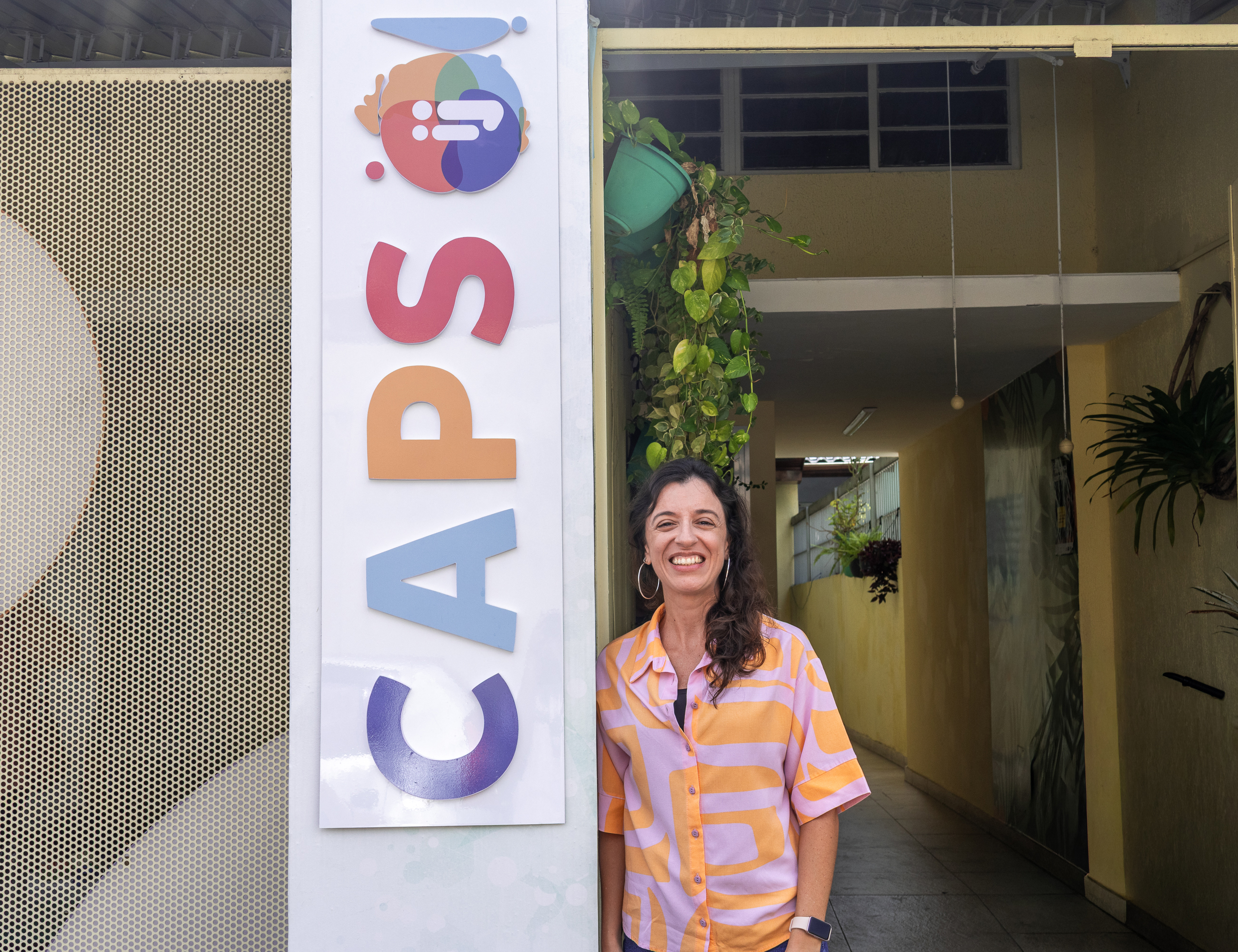 #ParaTodosVerem: A foto mostra uma mulher sorridente, de pele clara e cabelos castanhos ondulados, em pé na entrada de um prédio. Ela veste uma camisa com estampa geométrica em tons de rosa e laranja. Ao lado dela, à esquerda, há uma placa vertical branca com a inscrição CAPS ij em letras grandes e coloridas. Ela está posicionada no vão de uma porta aberta que revela um corredor interno com paredes amarelas e plantas penduradas.