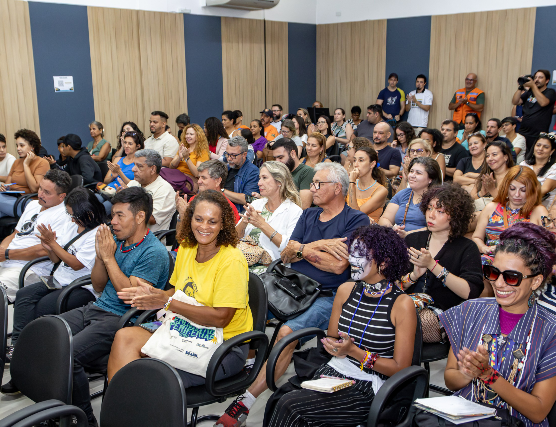 #PraTodosVerem: Imagens mostram várias pessoas dentro de uma auditório em pé, sentadas em círculo e falando ao microfone. Fim da descrição.