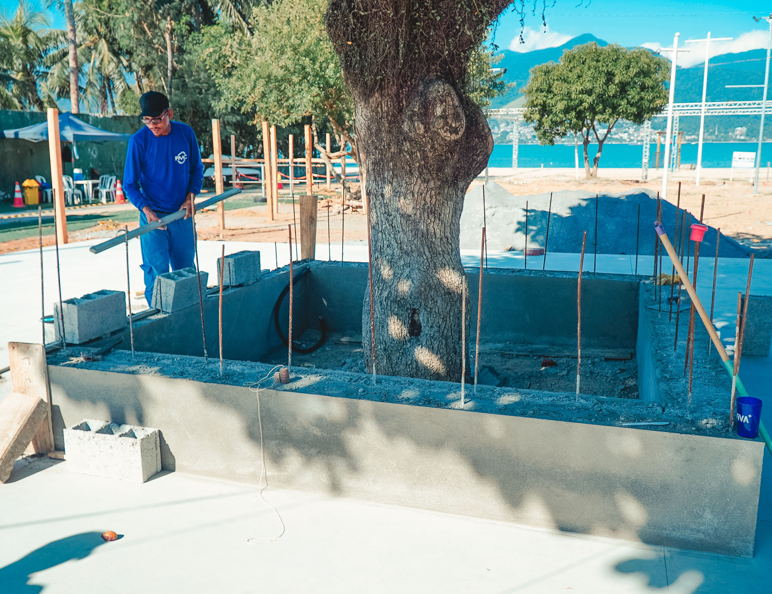 #PraTodosVerem: Trabalhadores operários realizando obra de reconstrução e reparação de praça perto da praia. Fim da descrição.