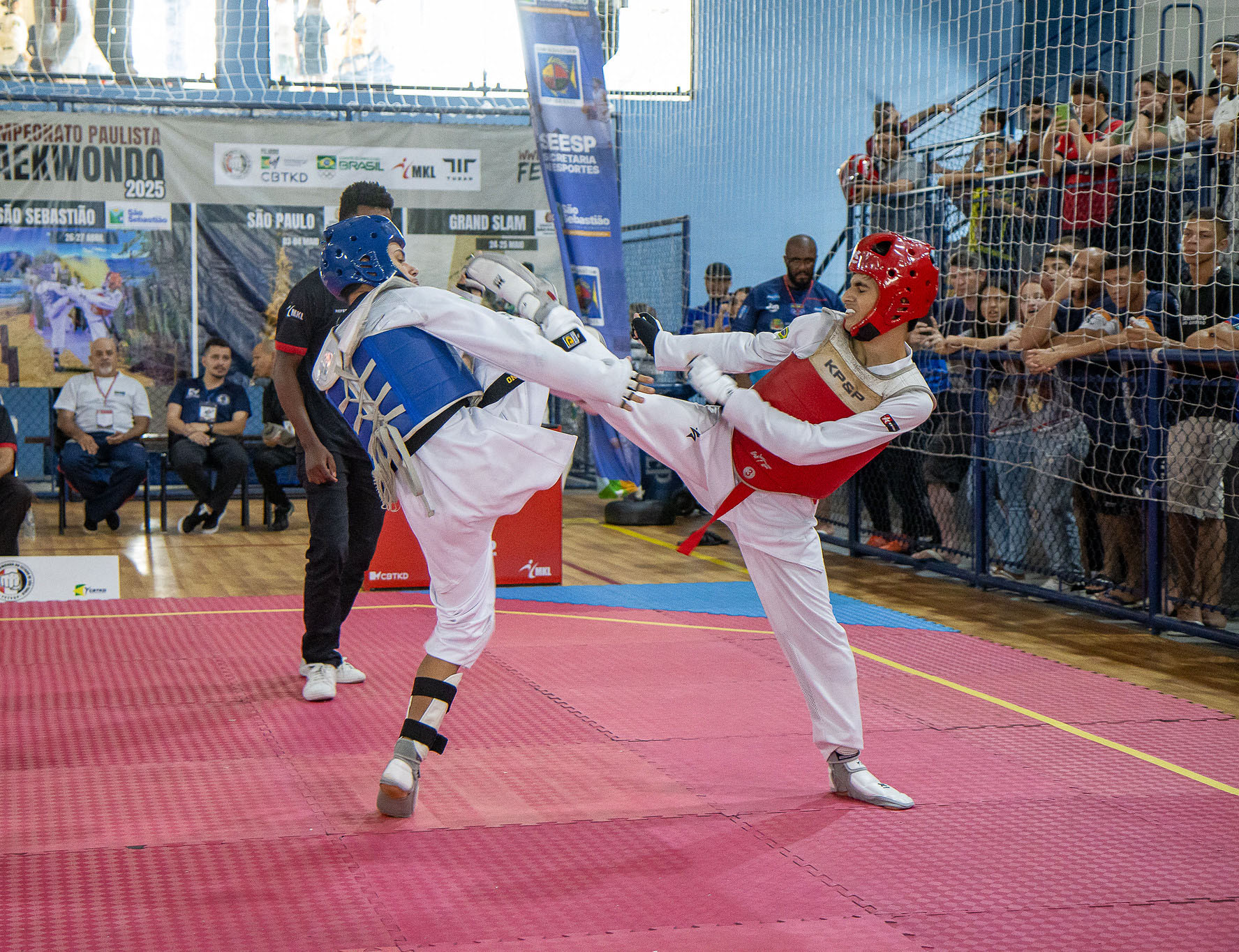 #PraTodosVerem: No Ginásio Municipal José de Souza Gringo atletas de Taekwondo protagonizam combates intensos durante o Campeonato Paulista 2025. Vestindo doboks brancos e proteções em azul e vermelho, os competidores aplicam chutes precisos sobre o tatame sob a supervisão rigorosa de árbitros e técnicos. O ambiente é vibrante, com o público acompanhando cada movimento das arquibancadas protegidas por redes. Ao fundo, banners do evento e as bandeiras do Brasil e da Coreia do Sul decoram o amplo espaço de teto metálico. Fim da descrição.