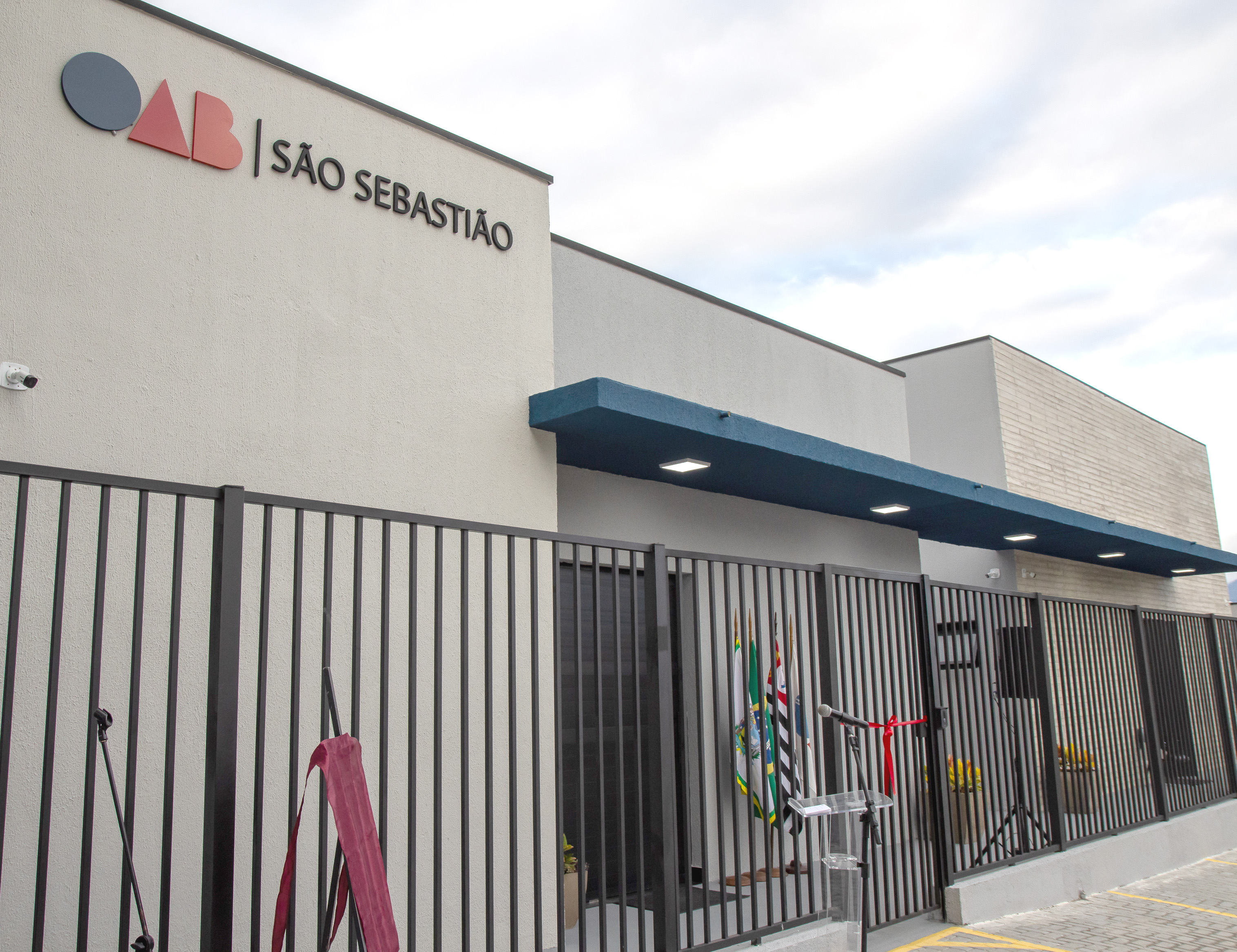 #PraTodosVerem: O conjunto de imagens destaca a fachada e a identidade visual da subseção da OAB em São Sebastião. O prédio moderno possui paredes em tons de cinza e branco, cercado por uma grade metálica preta e detalhes arquitetônicos em azul marinho. Na parte externa, vê-se uma estrutura para inauguração com fita vermelha, púlpito e bandeiras oficiais. O logotipo da OAB, composto por formas geométricas em azul e vermelho (círculo, triângulo e a letra B), aparece tanto na fachada externa quanto em uma parede interna branca, sempre acompanhado pelo nome da cidade em letras pretas. Fim da descrição.