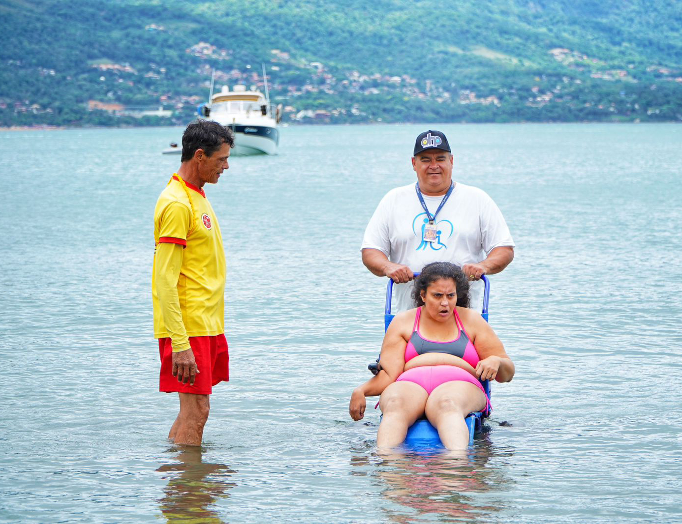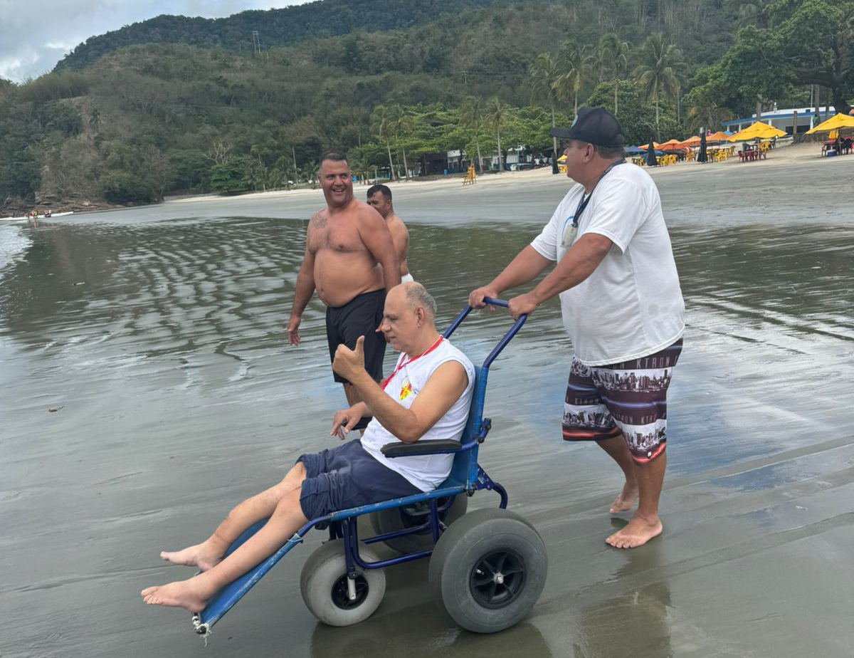 #PraTodosVerem: Sequência de fotos mostra o uso de cadeiras de rodas anfíbias em uma praia com montanhas ao fundo. Nas imagens, um homem de camiseta branca e boné conduz as cadeiras, que possuem rodas grandes e azuis, facilitando o deslocamento na areia e na água. Em uma das fotos, uma mulher de biquíni rosa é levada ao mar com o auxílio de um guarda-vidas; em outra, um homem sentado na cadeira sorri e faz um sinal de "joinha" na beira d'água. Fim da descrição.