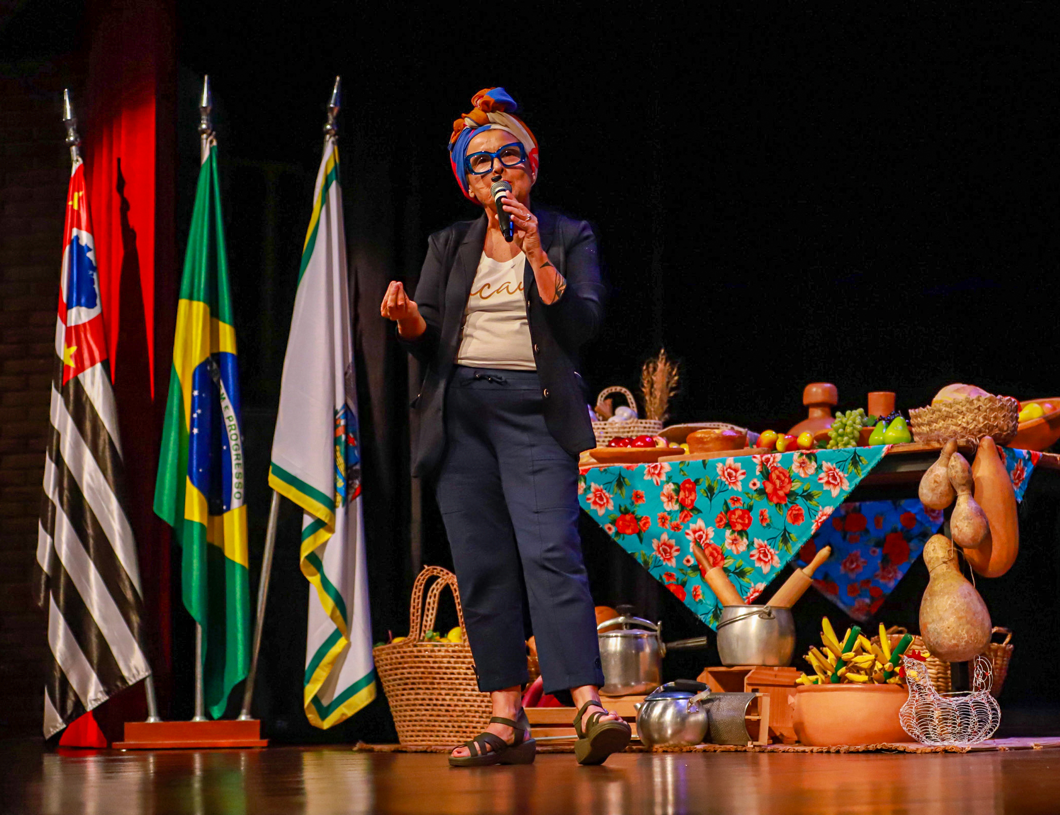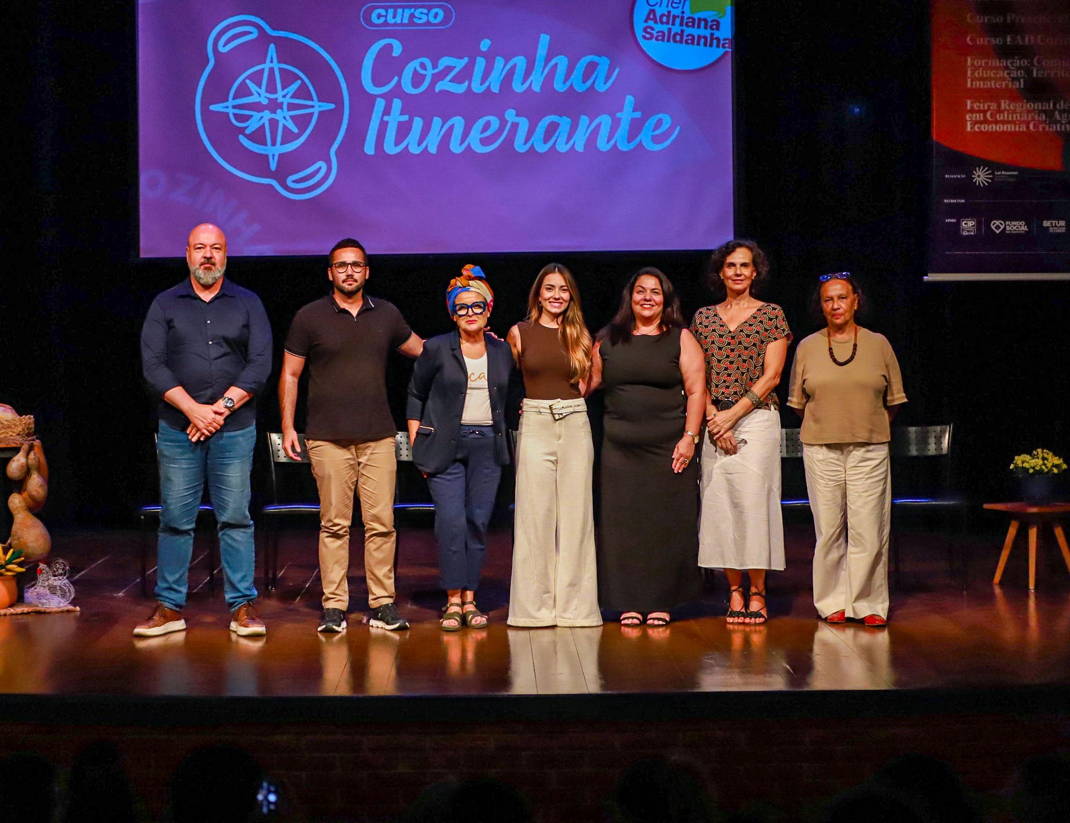 #PraTodosVerem: A primeira imagem mostra as autoridades presentes sentadas no palco, de frente para o público. Na segunda, elas aparecem em pé, lado a lado, sorrindo para a câmera. A terceira imagem destaca a chef Adriana Saldanha durante sua fala sobre o curso. Já a quarta foca na arquiteta Isabela Galvez enquanto fala sobre patrimônio imaterial e fala sobre o projeto. Fim da descrição.