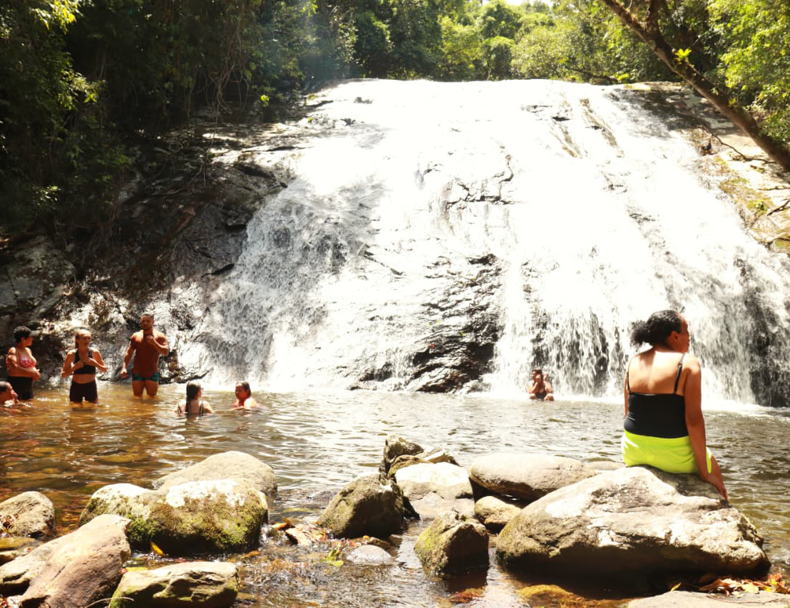 #PraTodosVerem: Imagem de uma mulher sentada à frente da queda da cachoeira e, ao fundo, um grupo de pessoas se banhando na piscina natural. Outra imagem mostra um grupo percorrendo a trilha que leva à cachoeira. A última imagem apresenta o grupo de participantes do passeio reunido. Fim da descrição.