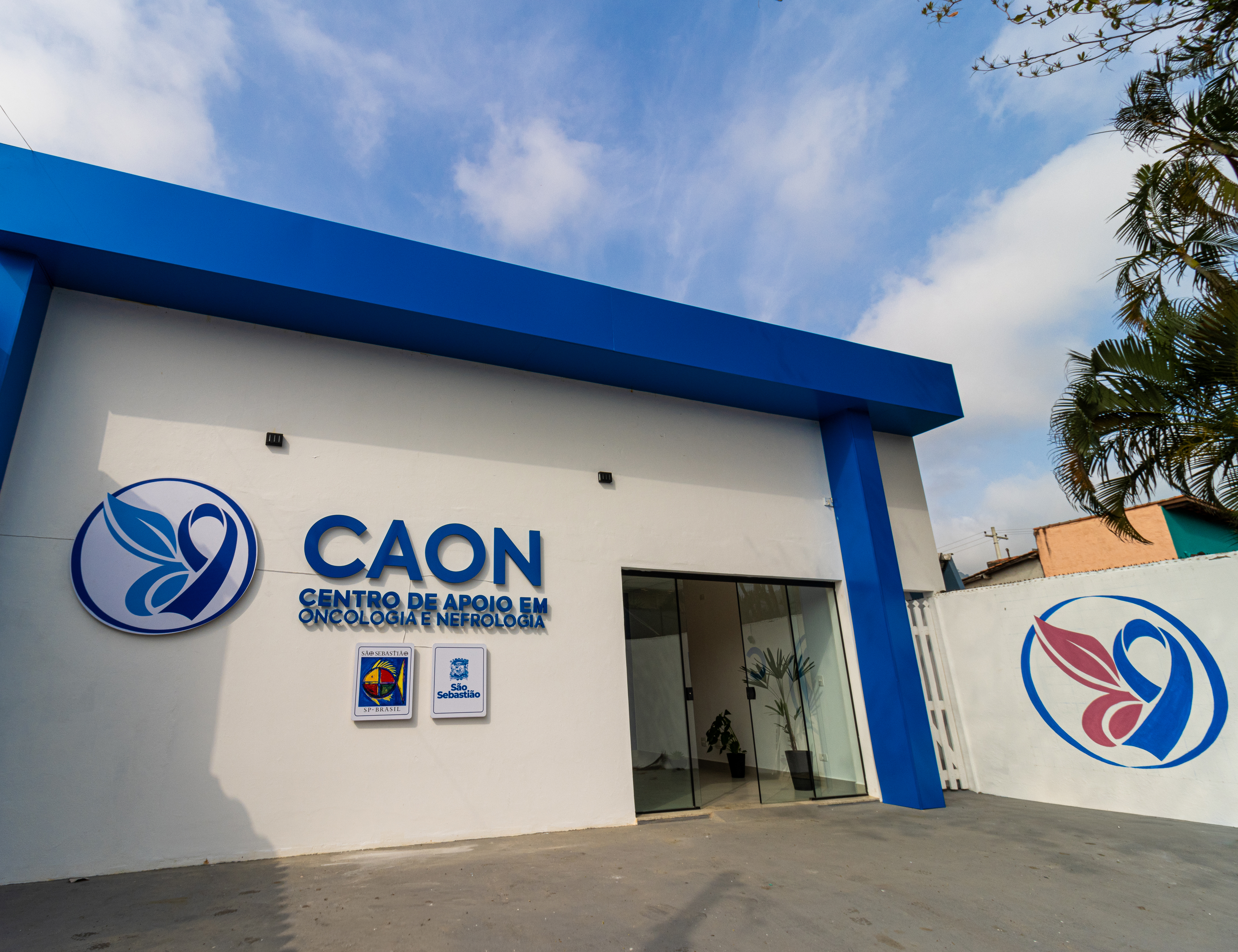 #PraTodosVerem: A imagem mostra a fachada do CAON (Centro de Apoio em Oncologia e Nefrologia) em São Sebastião, um edifício térreo branco com detalhes em azul vibrante na platibanda e em uma coluna lateral. À esquerda da entrada de vidro, destaca-se o logotipo circular com laços estilizados e o nome do centro, acompanhados pelos brasões oficiais da cidade. No muro à direita, o mesmo logotipo aparece em uma versão maior e colorida em tons de rosa e azul, sob um céu claro com poucas nuvens. Fim da descrição.