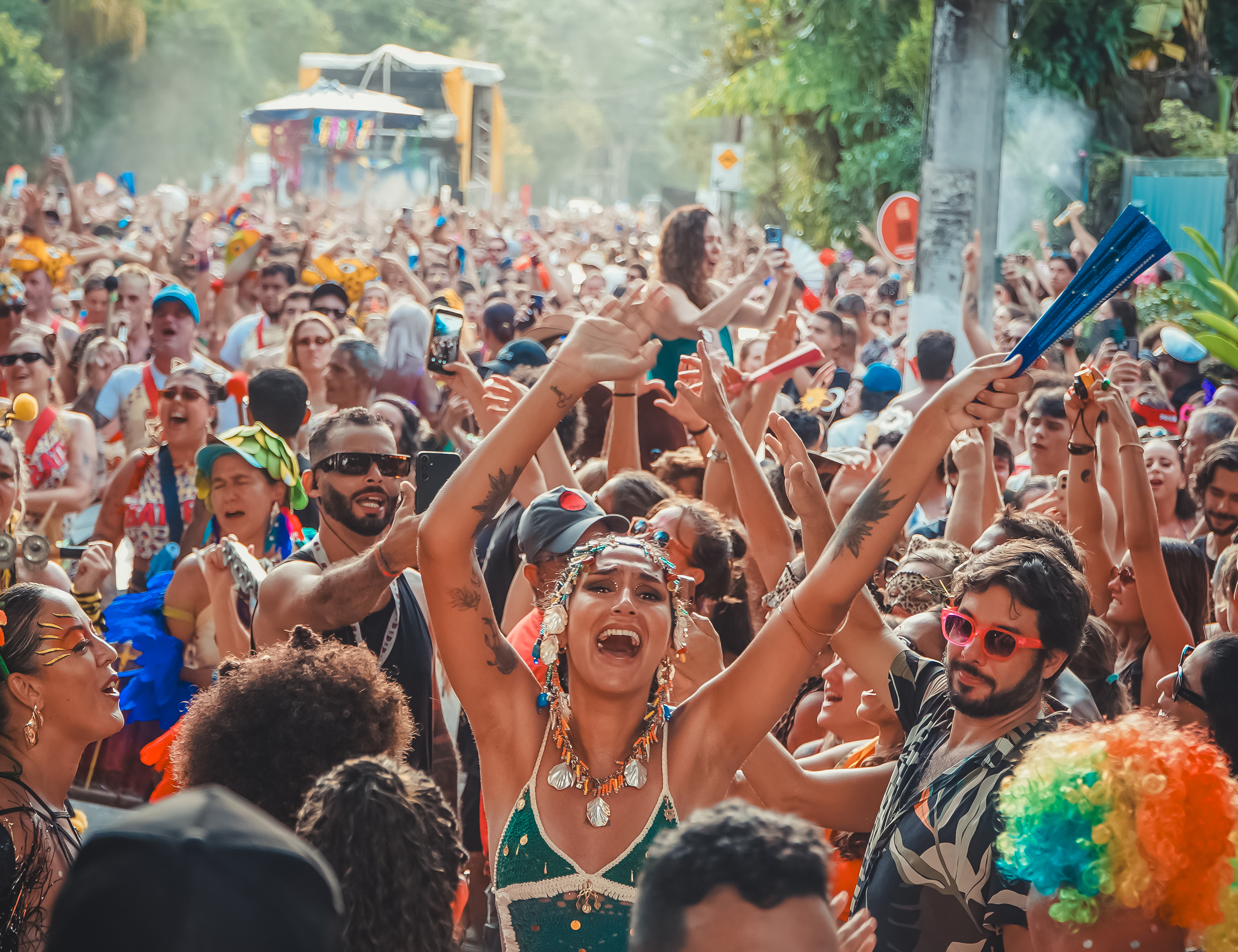 #PraTodosVerem: Sequência de quatro imagens destacando o turismo em São Sebastião. A primeira mostra uma vista aérea da Praia da Enseada com sua larga faixa de areia clara repleta de banhistas e guarda-sóis coloridos. A segunda detalha a areia movimentada sob o sol, cercada por morros verdes ao fundo. A terceira exibe o pôr do sol na orla, com silhuetas de pessoas admirando o horizonte e a Ilha Montão de Trigo. A última captura a energia do Carnaval de rua, com uma multidão festiva e colorida celebrando sob a luz do dia. Fim da descrição.