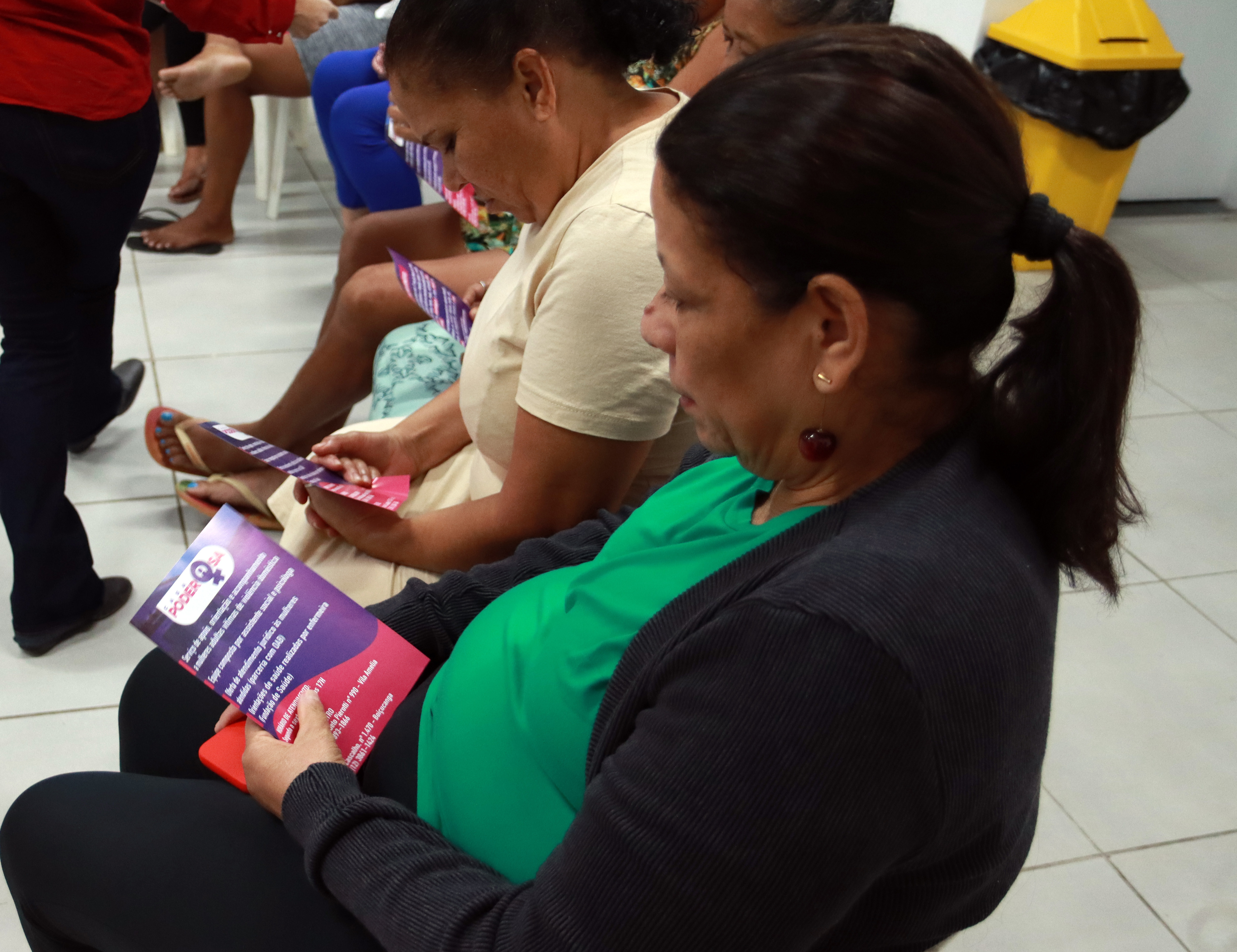 #PraTodosVerem: Sequência de fotos mostra o projeto "Elas Querem Saber", com orientações jurídicas para mulheres. Na primeira imagem, uma mulher de azul assina documentos em uma mesa técnica ao lado de um banner informativo. Na segunda, um grupo de mulheres está sentado em círculo em uma sala ampla, sorrindo e batendo palmas para uma palestrante ao centro. A terceira foto foca em duas mulheres sentadas lendo folhetos informativos coloridos sobre os serviços de apoio e acolhimento oferecidos. Fim da descrição.
