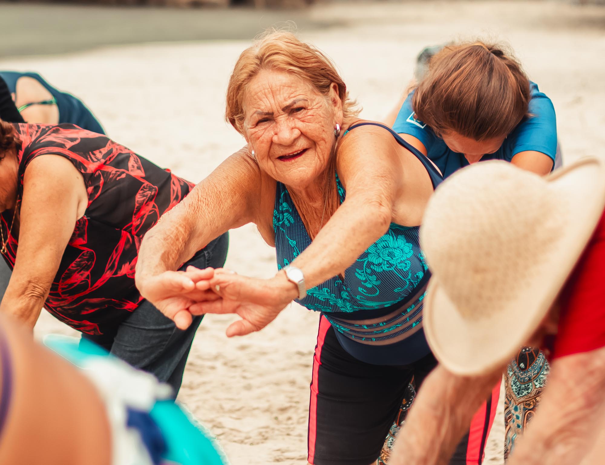 #PraTodosVerem: imagem de um grupo de mulheres reunidas felizes e alegres durante a vivencia, mais uma image de um grupo de pessoas praticando alongamento na praia durante o encontro, mais uma imagem de 4 mulheres na praia durante a vivência. Fim da descrição.