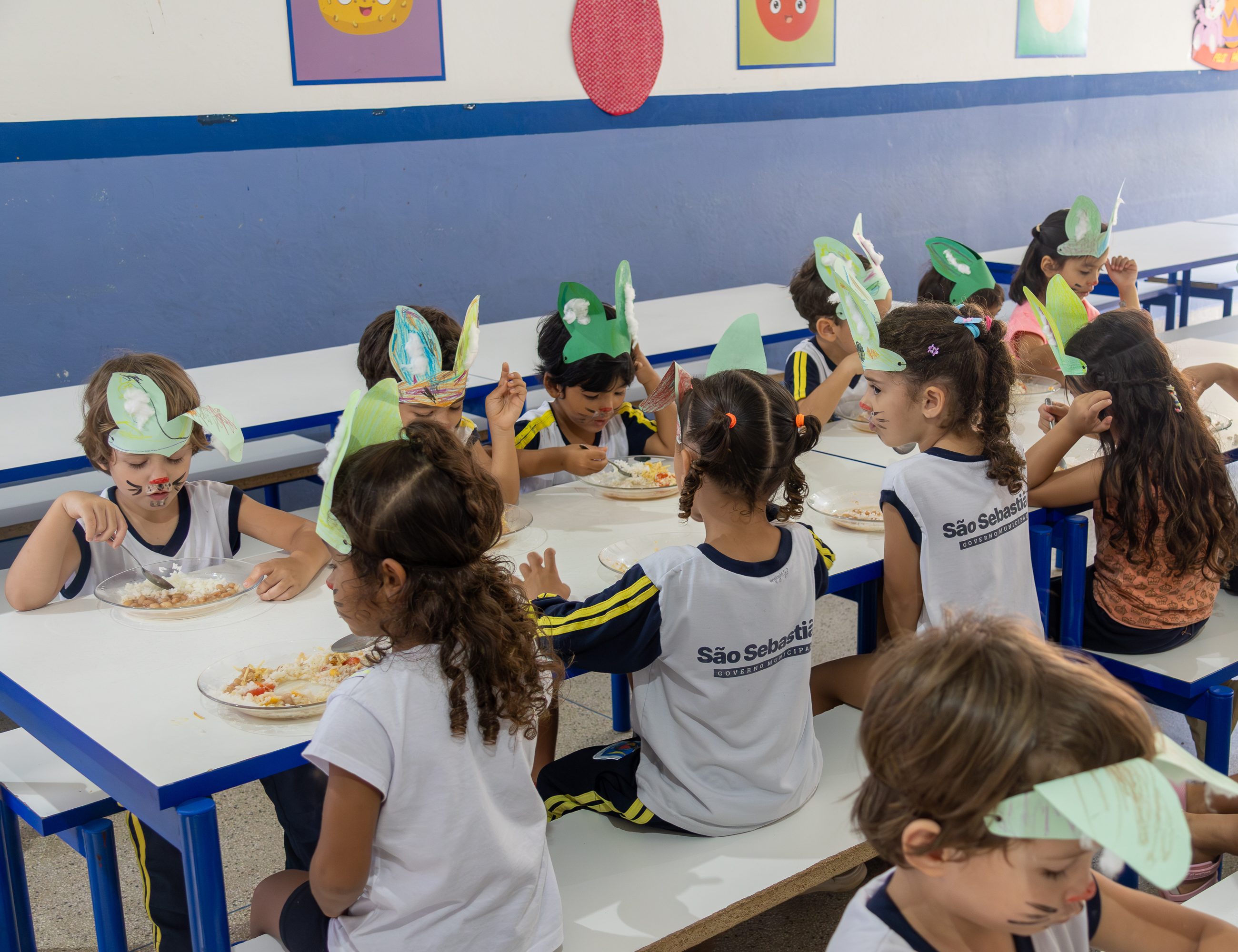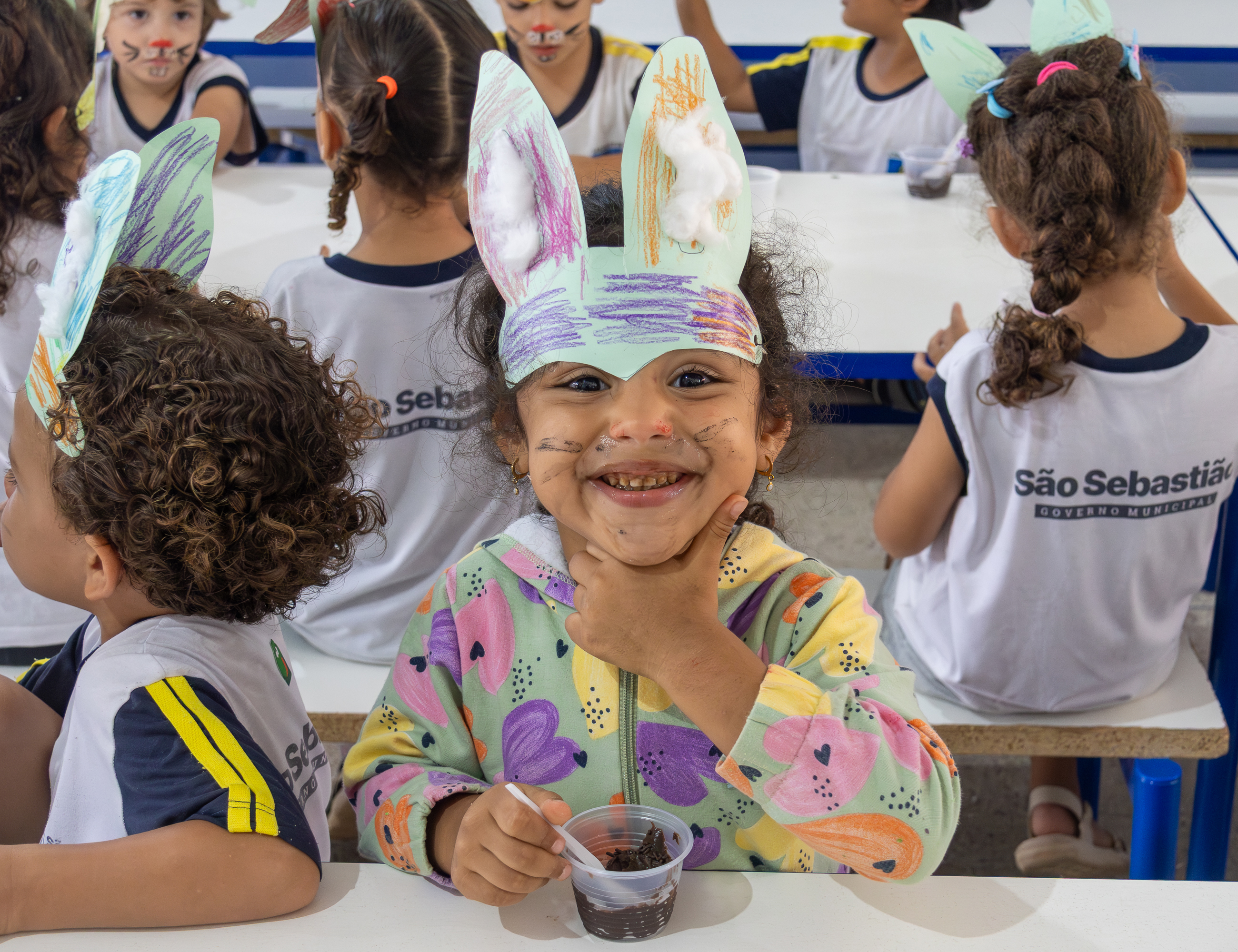 #PraTodosVerem: Conjunto de quatro fotos de uma atividade de Páscoa em uma escola municipal de São Sebastião. As imagens mostram estudantes em mesas com alimentação escolar, usando orelhas de coelho feitas de papel e maquiagem temática no rosto, além de registros com profissionais da unidade escolar no pátio, em ambiente coletivo e de integração. Fim da descrição.