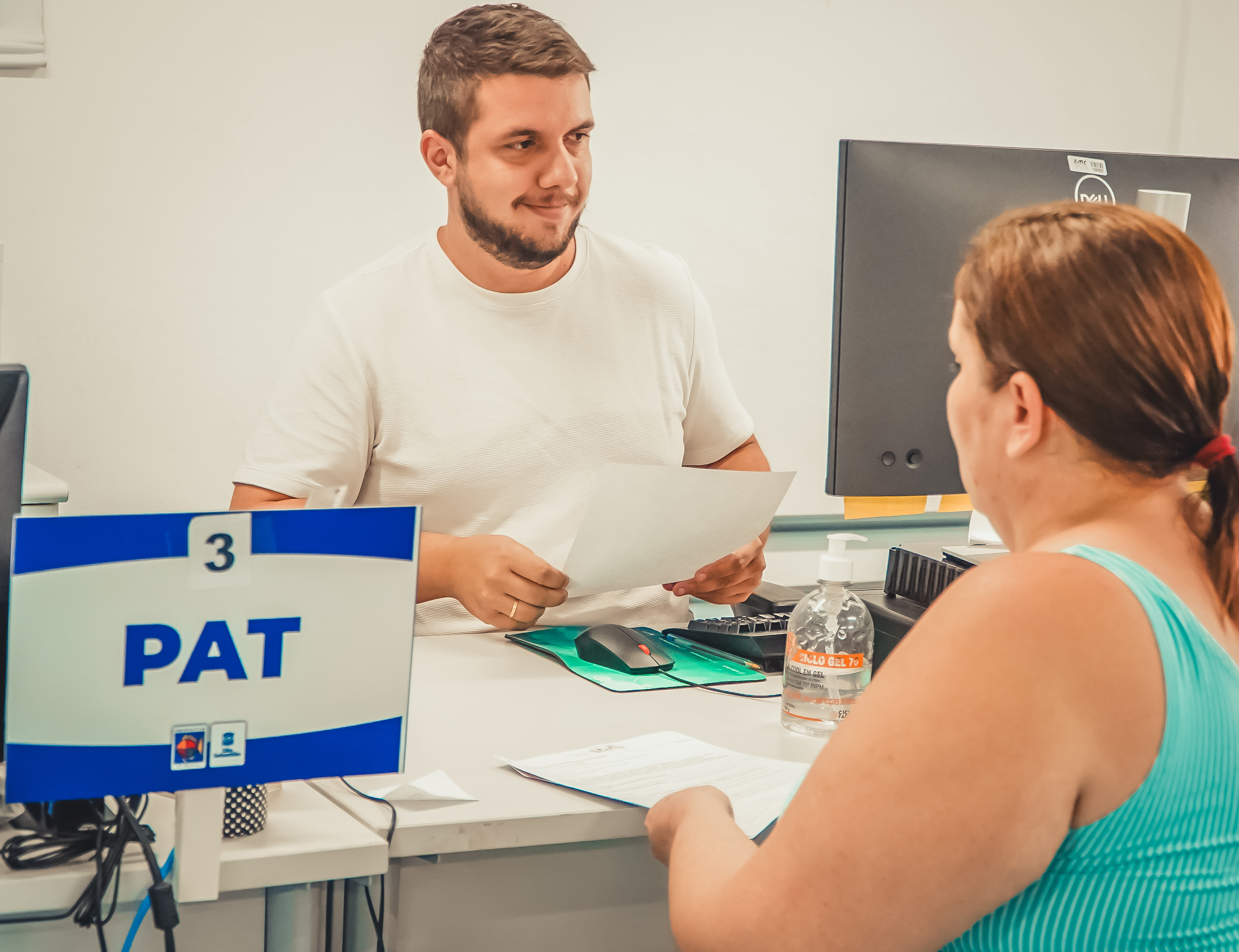 #PraTodosVerem: A primeira imagem mostra um atendimento no PAT, com um funcionário analisando documentos enquanto conversa com uma mulher sentada à sua frente. A segunda imagem registra outro atendimento, com um servidor sorrindo durante a orientação a uma participante sentada do outro lado da mesa. A terceira imagem apresenta uma carteira de trabalho posicionada sobre uma superfície. Fim da descrição.