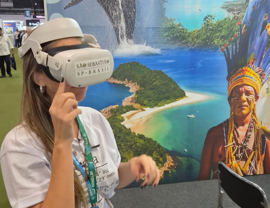 #PraTodosVerem: Imagens mostram a participação de São Sebastião em evento institucional de turismo. Em um estande, um homem apresenta materiais informativos e um óculos de realidade virtual; em outra cena, uma mulher utiliza o equipamento. Há também um painel com debatedores em um palco e, por fim, o público acompanha a programação, com alguns participantes utilizando fones de tradução. Fim da descrição.