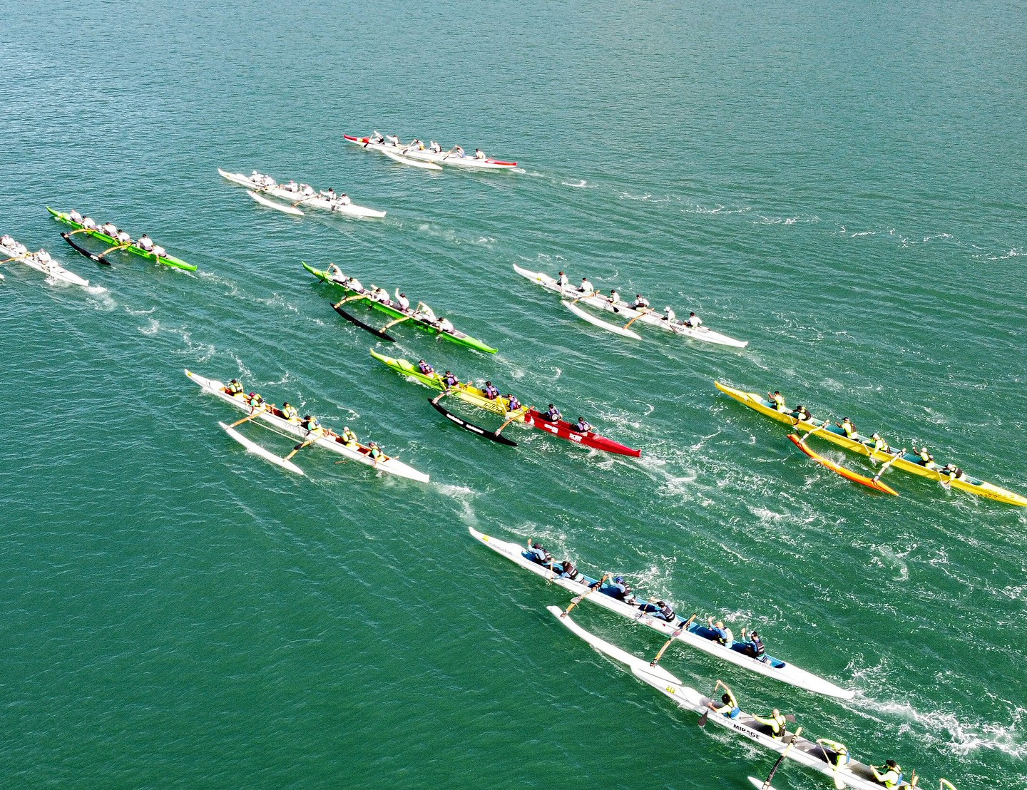 #PraTodosVerem: Registro aéreo e lateral de canoas havaianas no mar, no Campeonato Brasileiro de Va’a, em São Sebastião, realizado em 2022, com várias equipes remando em embarcações coloridas próximas à faixa de areia. As imagens mostram os atletas alinhados sobre a água azul-esverdeada, disputando a prova em diferentes trechos do percurso, enquanto a praia ao fundo reúne público, tendas, coqueiros e canoas estacionadas na beira do mar. Fim da descrição.