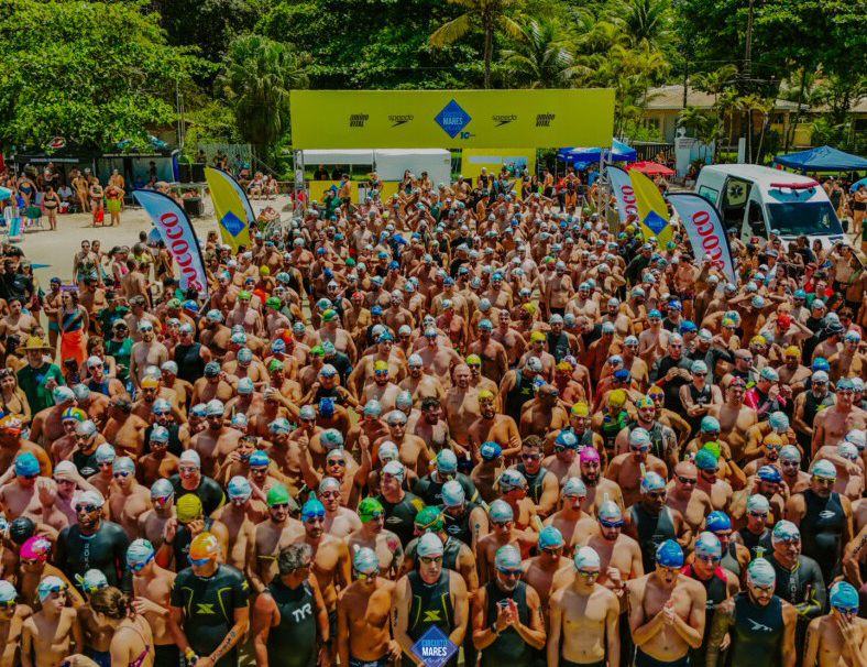 #PraTodosVerem: imagens de atletas participando da tradicional 2ª etapa do Circuito Mares 2025, que reuniu cerca de 2.300 e provas de Maratona Aquática, Aquathlon e corrida. Fim da descrição.