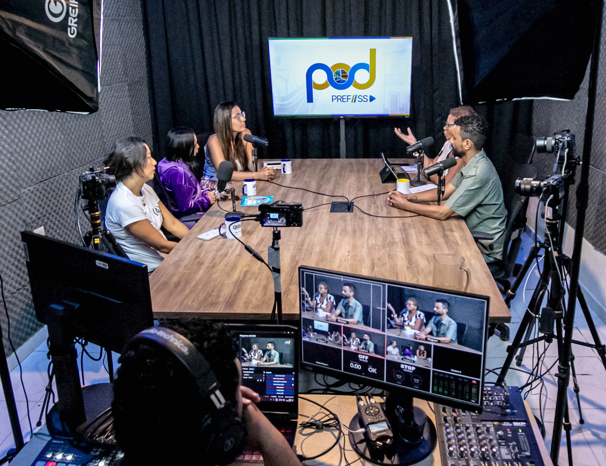 #PraTodosVerem: As imagens registram o clima descontraído da gravação do Pod PrefSS, com os participantes reunidos em estúdio, sorridentes e à vontade durante a conversa. Sentados à mesa, eles compartilham o momento com canecas personalizadas do programa, enquanto o cenário exibe o logotipo no monitor ao fundo. Fim da descrição.