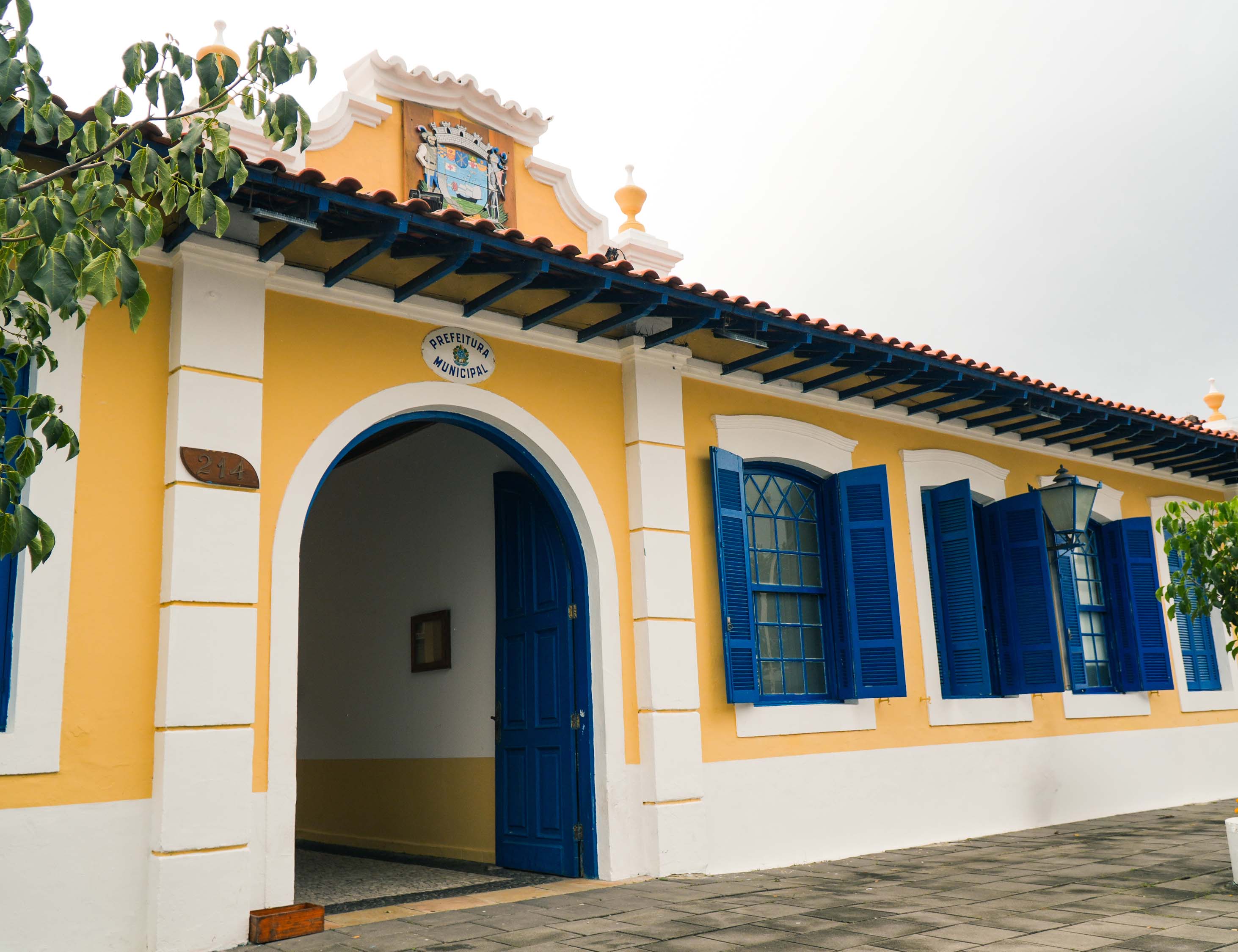 #PraTodosVerem: As imagens mostram a frente do paço municipal, nas cores amarelo, azul e branco. Fim da descrição.