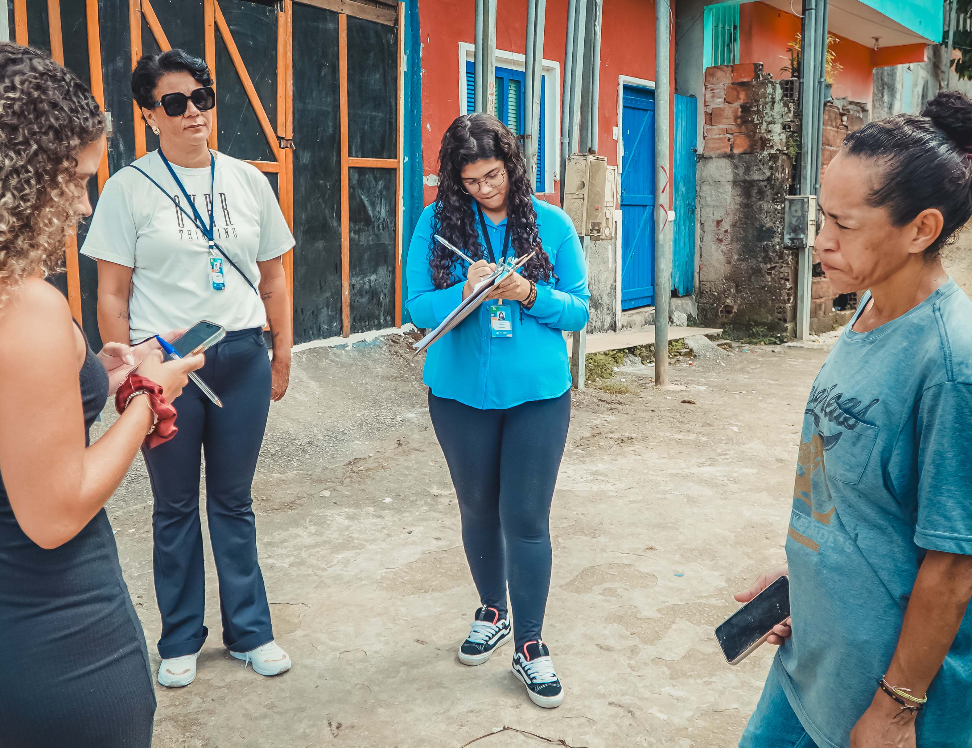 #PraTodosVerem: É possível ver na imagem o grupo de monitores e, na foto seguinte estão realizando o cadastramento com os moradores, na rua a jovem monitora, com camisa azul, aparece segurando uma prancheta conversando com três mulheres, moradoras da Vila Sahy, a mesma também aprece na imagem seguinte conversando com um homem sentado na calçada. Fim da descrição.