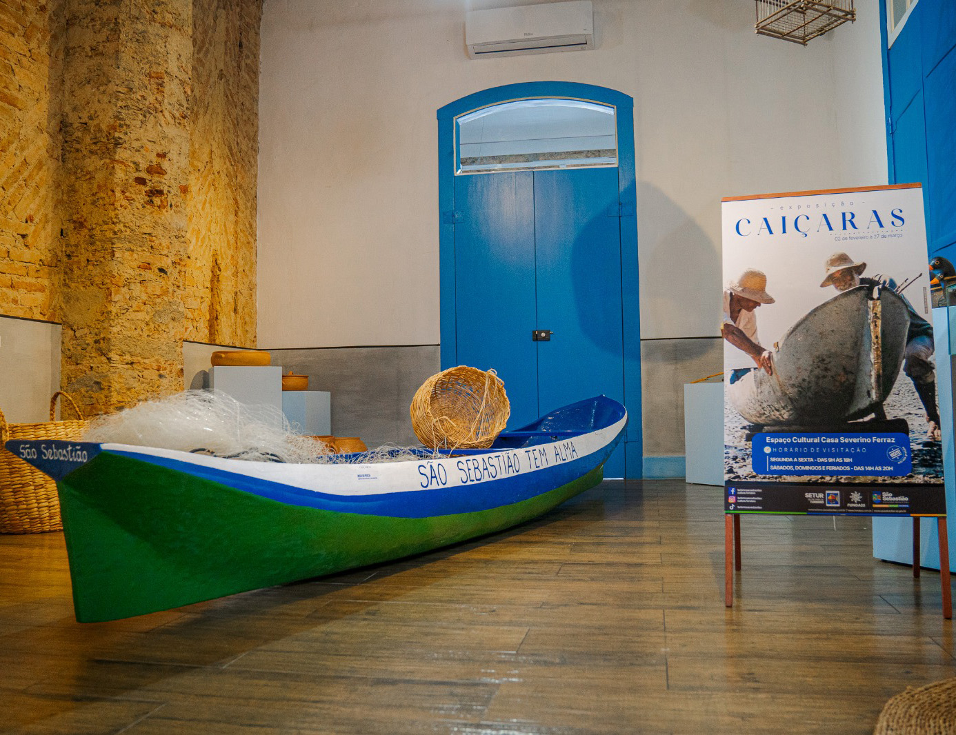 Ainda no campo da memória cultural, a Casa Severino Ferraz abriga duas exposições dedicadas aos saberes tradicionais. Uma delas apresenta uma canoa caiçara histórica confeccionada em madeira de guapuruvu durante o projeto “São Sebastião tem Alma”. O espaço também reúne objetos artesanais em madeira, caxeta, cerâmica e taboa produzidos por mestres da cultura popular, além da mostra “Memórias Caiçaras”, que traz painéis e publicações sobre a formação da cidade e o modo de vida das comunidades tradicionais.
