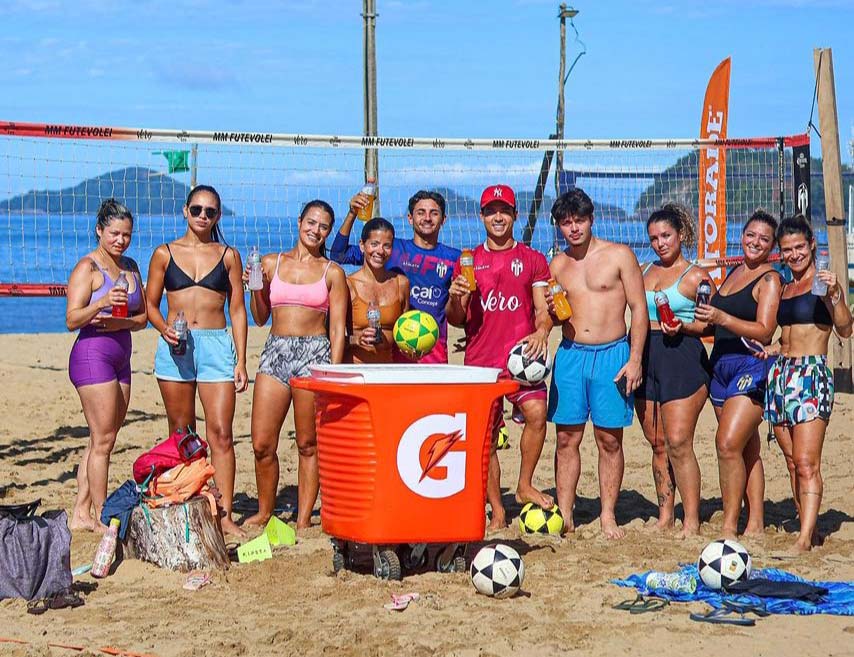 #PraTodosVerem: Nas imagens, atletas e participantes aparecem em diferentes momentos das aulas e do circuito do Projeto MM Futevôlei, realizados na areia da praia, com rede montada à beira-mar e paisagem litorânea ao fundo. Em uma das cenas, um jogador executa uma bicicleta no ar para alcançar a bola acima da rede, levantando areia durante o movimento, enquanto outro atleta acompanha a jogada. Em outra, um grupo de homens e mulheres posa sorrindo ao redor de um cooler, segurando garrafas e bolas de futevôlei, em clima de integração e confraternização. Fim da descrição.