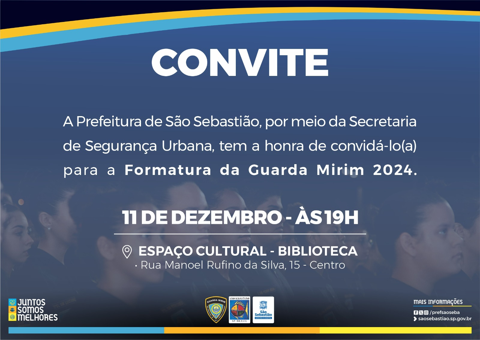 A Prefeitura de São Sebastião realiza, nesta quarta-feira (11), a partir das 19h, no Espaço Cultural da Biblioteca, a formatura de 113 guardas mirim da turma de 2024. Este grupo passou pelo curso de formação no período de fevereiro a novembro deste ano.