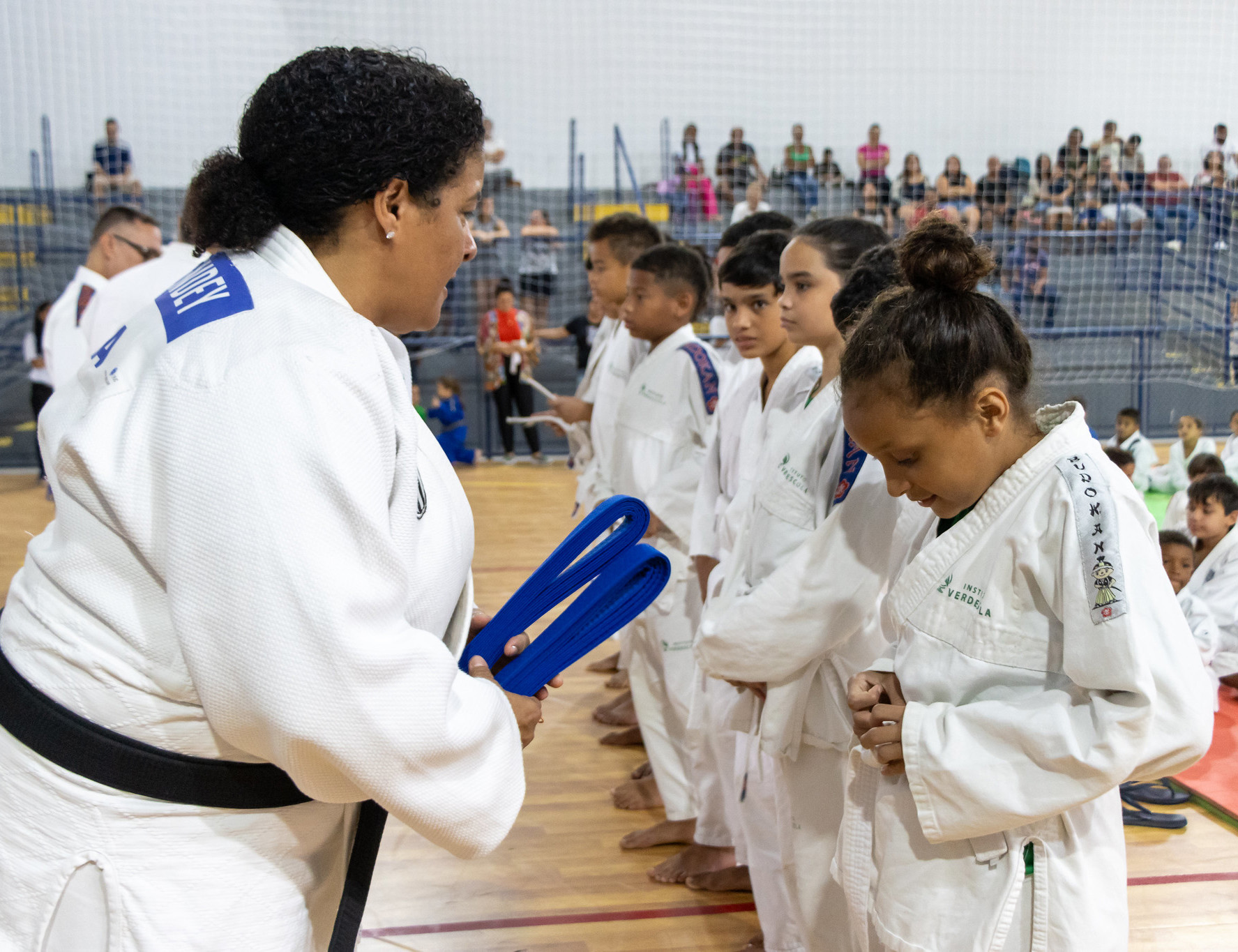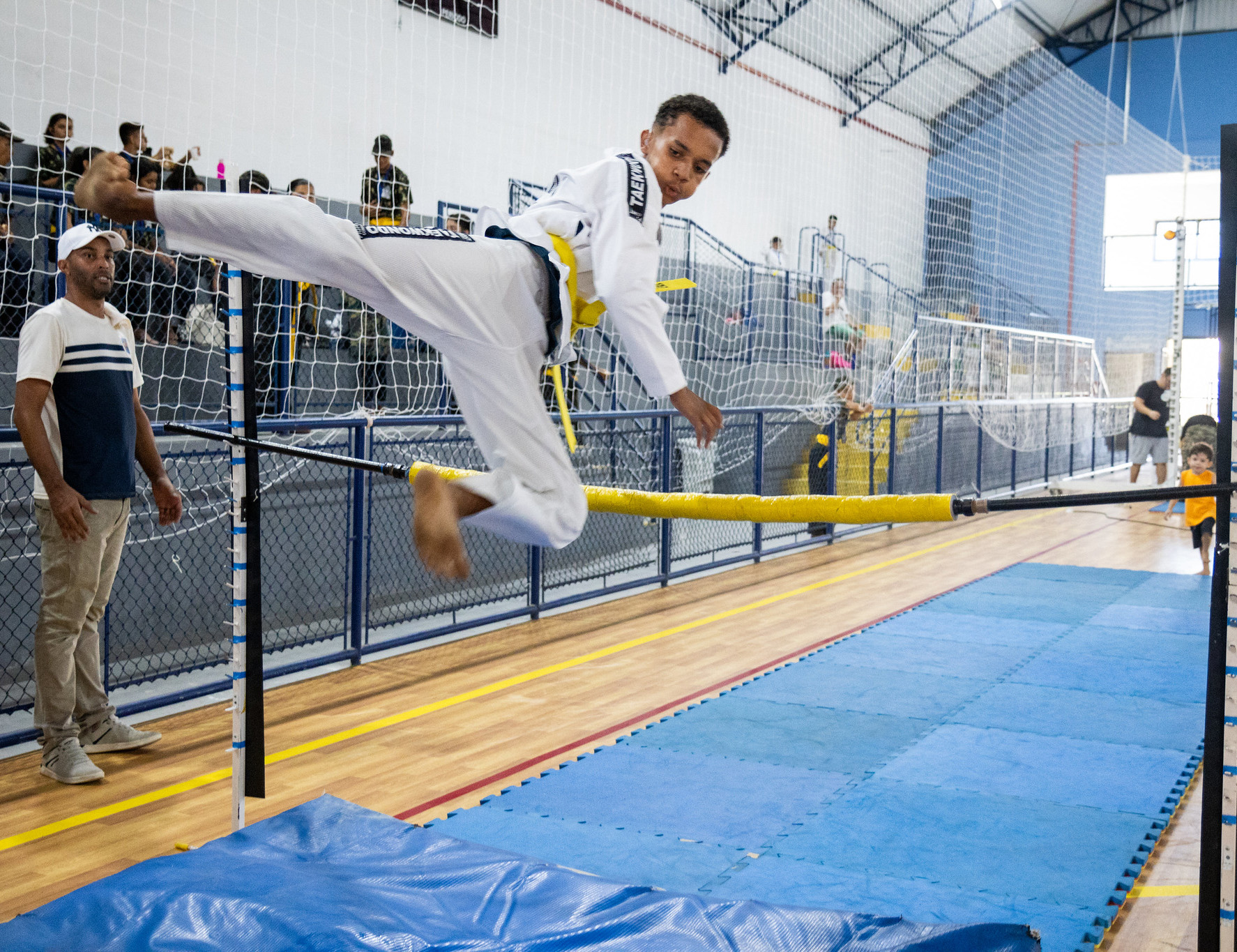 #PraTodosVerem: As imagens retratam atividades esportivas em um ginásio coberto, com público nas arquibancadas ao fundo. A primeira foto mostra uma mulher, com faixa preta de judô, entregando faixas azuis para uma fila de crianças vestindo quimonos brancos, indicando uma cerimônia de graduação ou premiação de judô. A segunda imagem foca em um jovem em um quimono branco com faixa amarela, realizando um salto sobre uma barra em uma pista azul, demonstrando uma técnica de Taekwondo, com um adulto observando ao lado. Fim da descrição.
