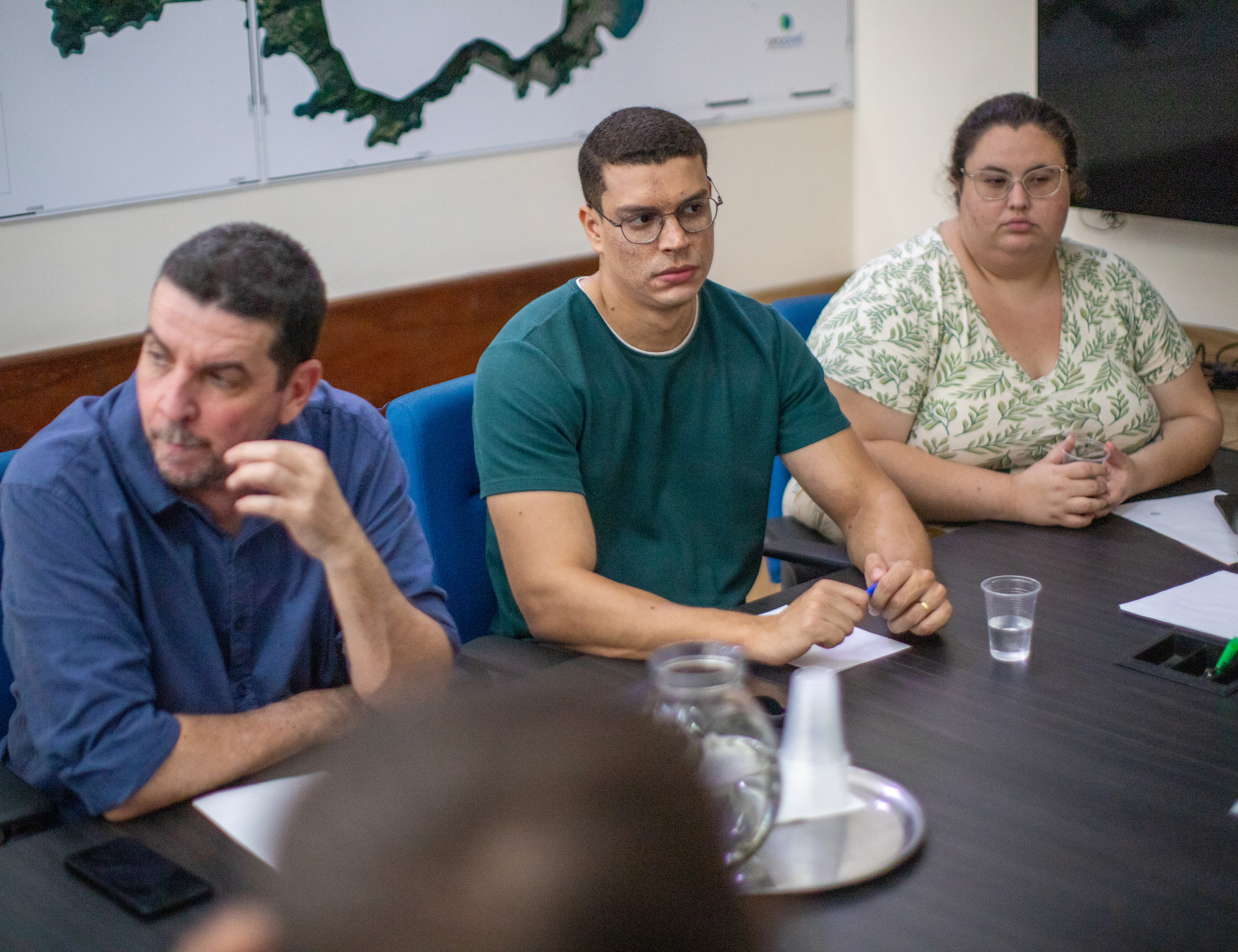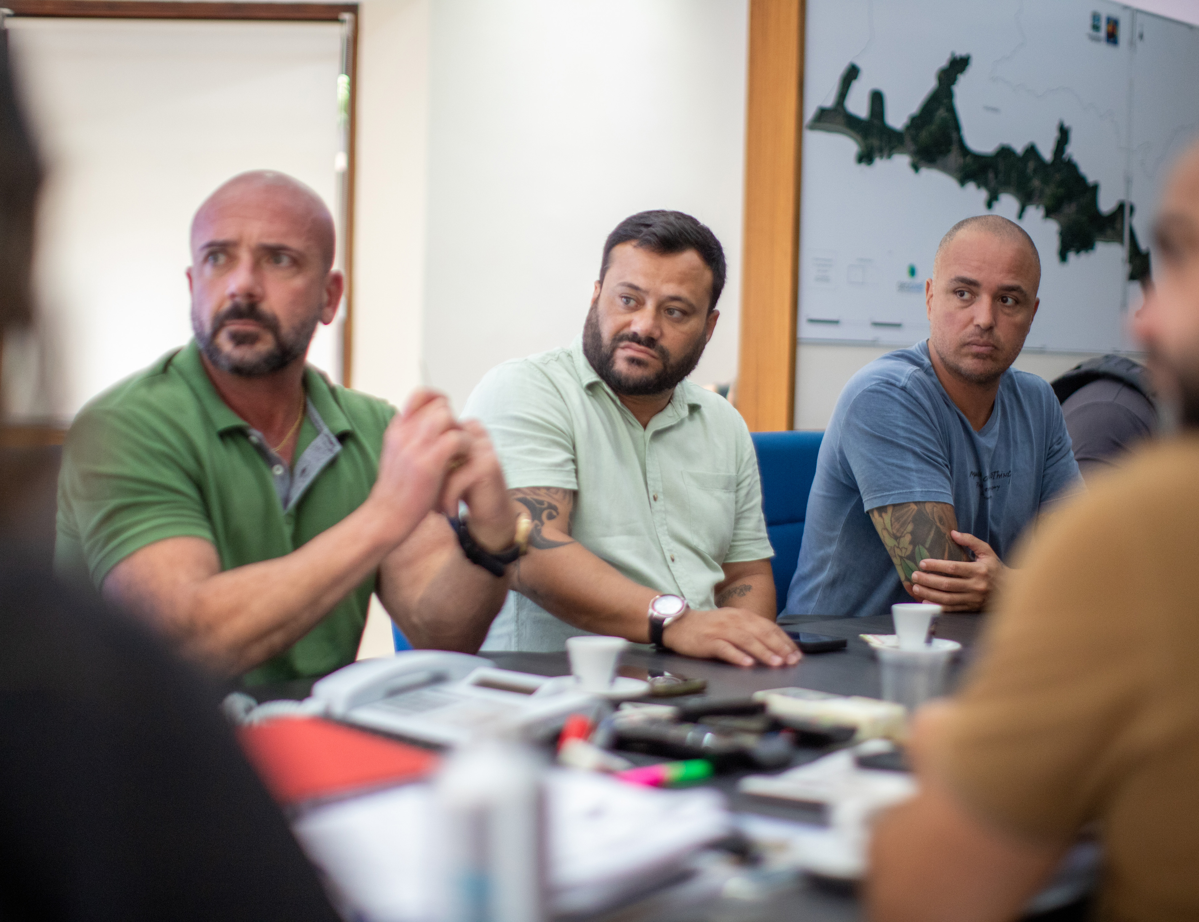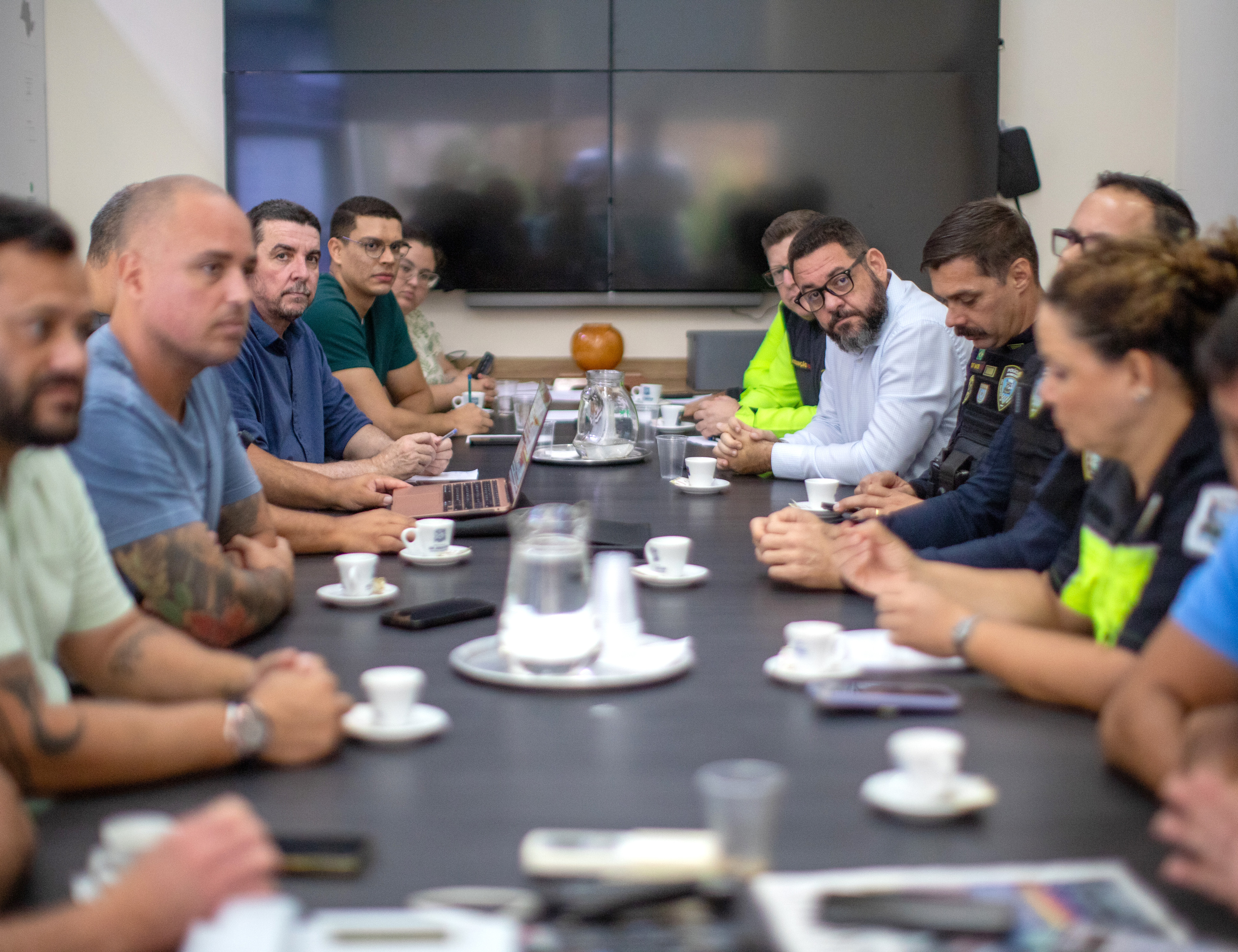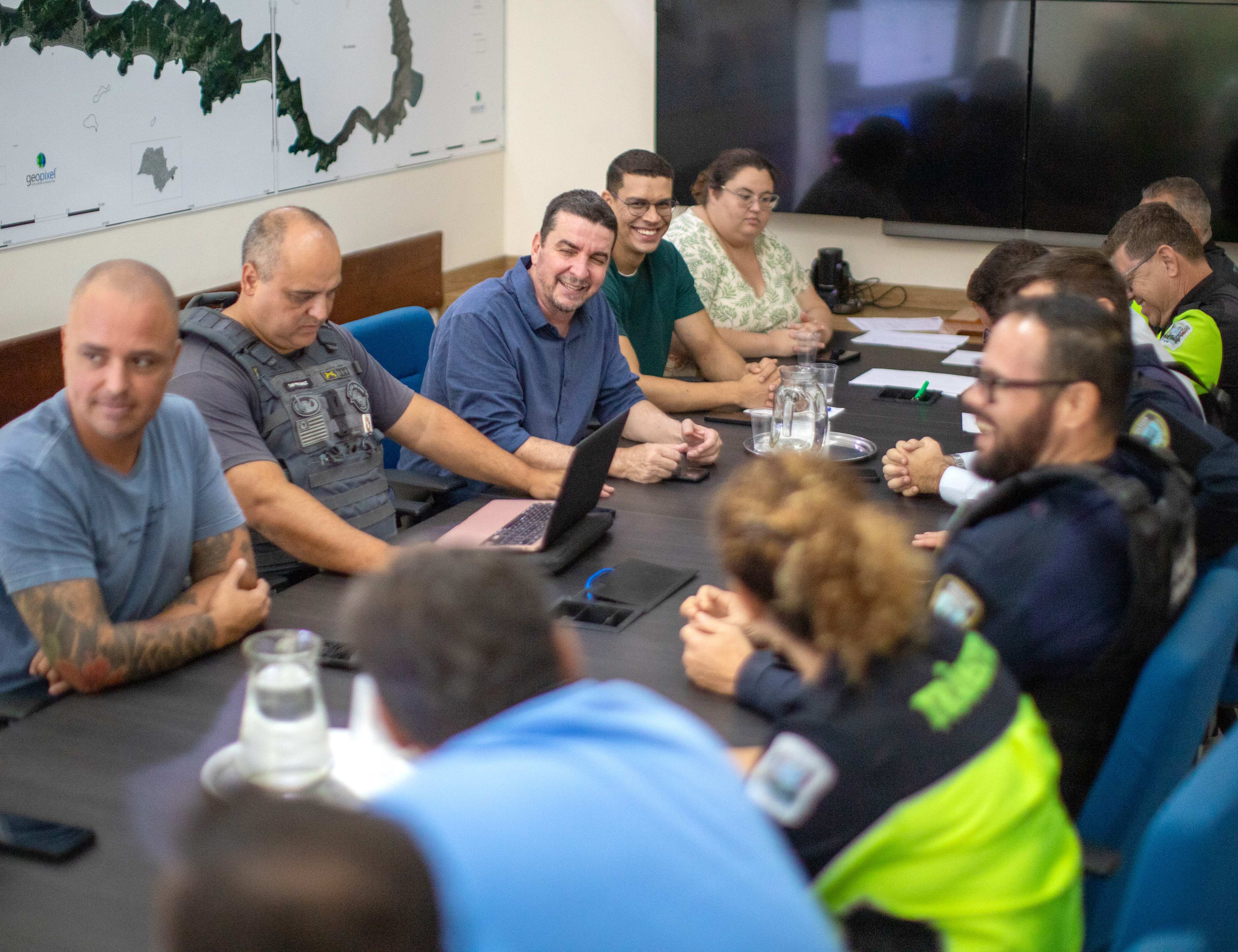 #PraTodosVerem: Conjunto de quatro fotografias coloridas retrata uma reunião estratégica em uma sala de reuniões, onde homens e mulheres, alguns em trajes civis e outros com uniformes operacionais de segurança e trânsito, estão sentados ao redor de uma mesa escura com cafés, garrafas de água e notebooks. O ambiente possui paredes claras decoradas com mapas geográficos e telas de monitoramento ao fundo, alternando entre momentos de concentração séria e interações descontraídas com sorrisos. As imagens priorizam planos médios e fechados, destacando os participantes em debate e a atmosfera de planejamento conjunto. Fim da descrição.