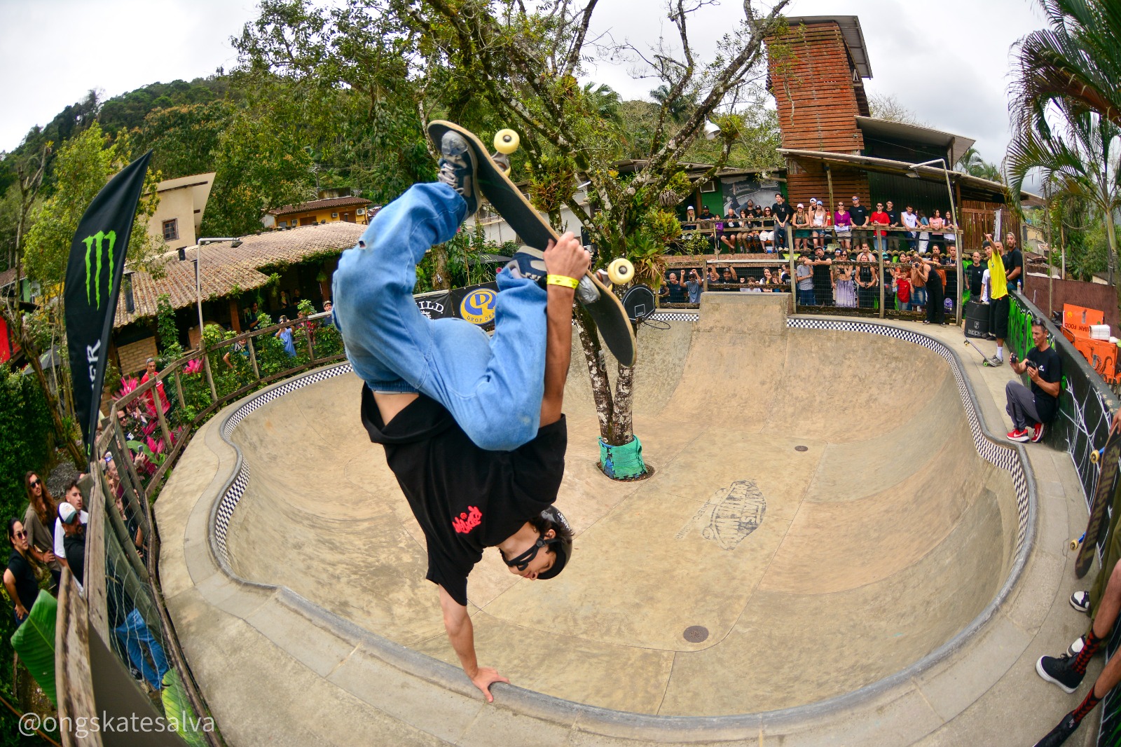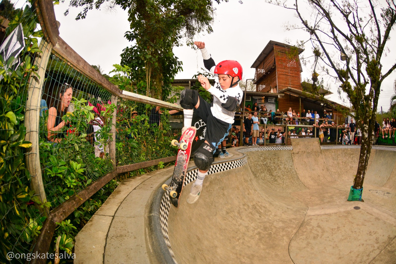 #PraTodosVerem: Cenas vibrantes do Circuito Paulista de Skate mostram atletas de diferentes idades e estilos executando manobras radicais em uma pista de bowl cercada por público animado. Uma jovem skatista, equipada com capacete lilás e joelheiras, inicia sua descida com concentração; um competidor salta no ar com as rodas verdes de seu skate em destaque; outro atleta realiza um impressionante handplant invertido na borda da pista, enquanto a plateia observa atenta; e um jovem de capacete vermelho executa uma manobra na transição com destreza, cercado pelo cenário verde e pelo clima descontraído do evento. Fim da descrição.