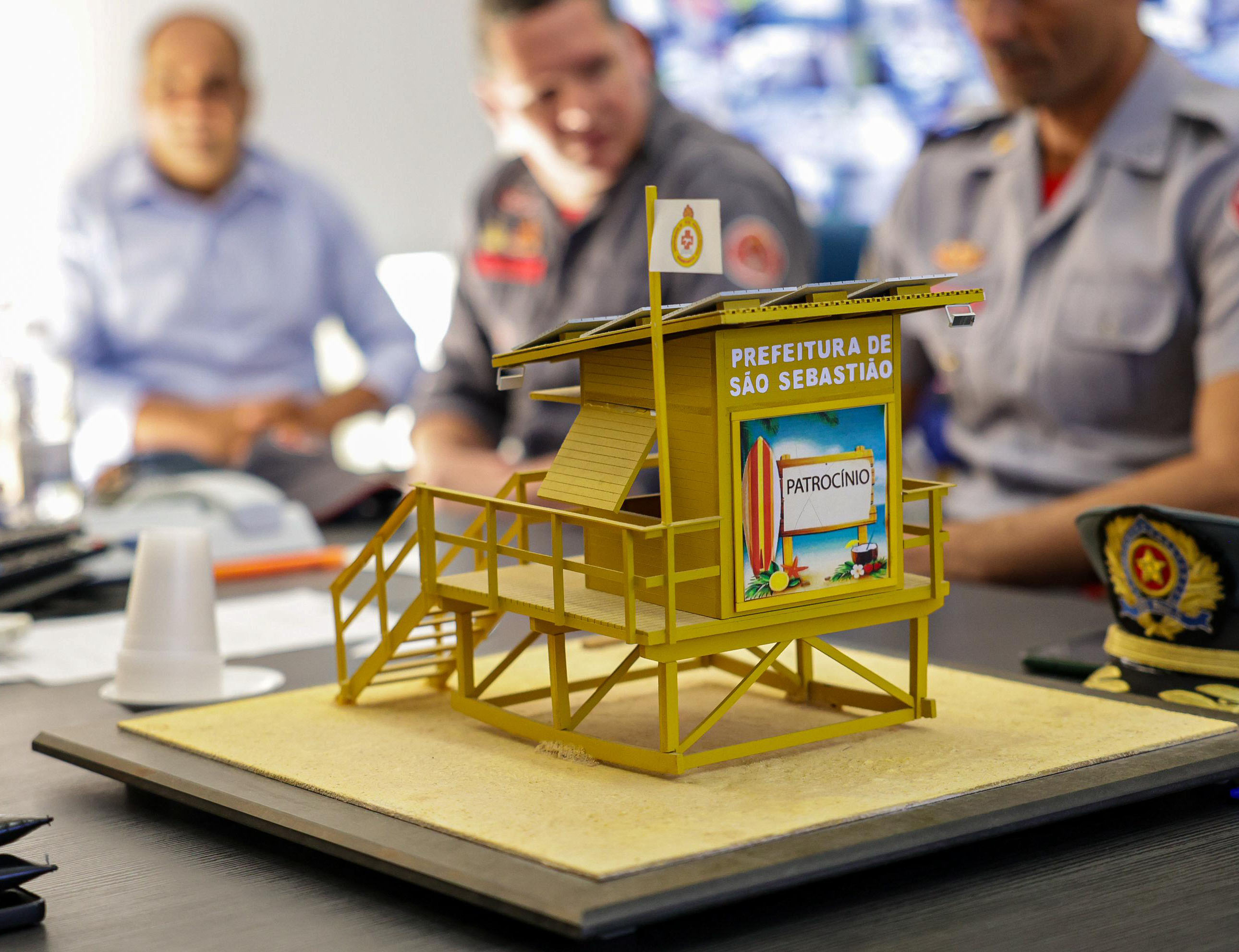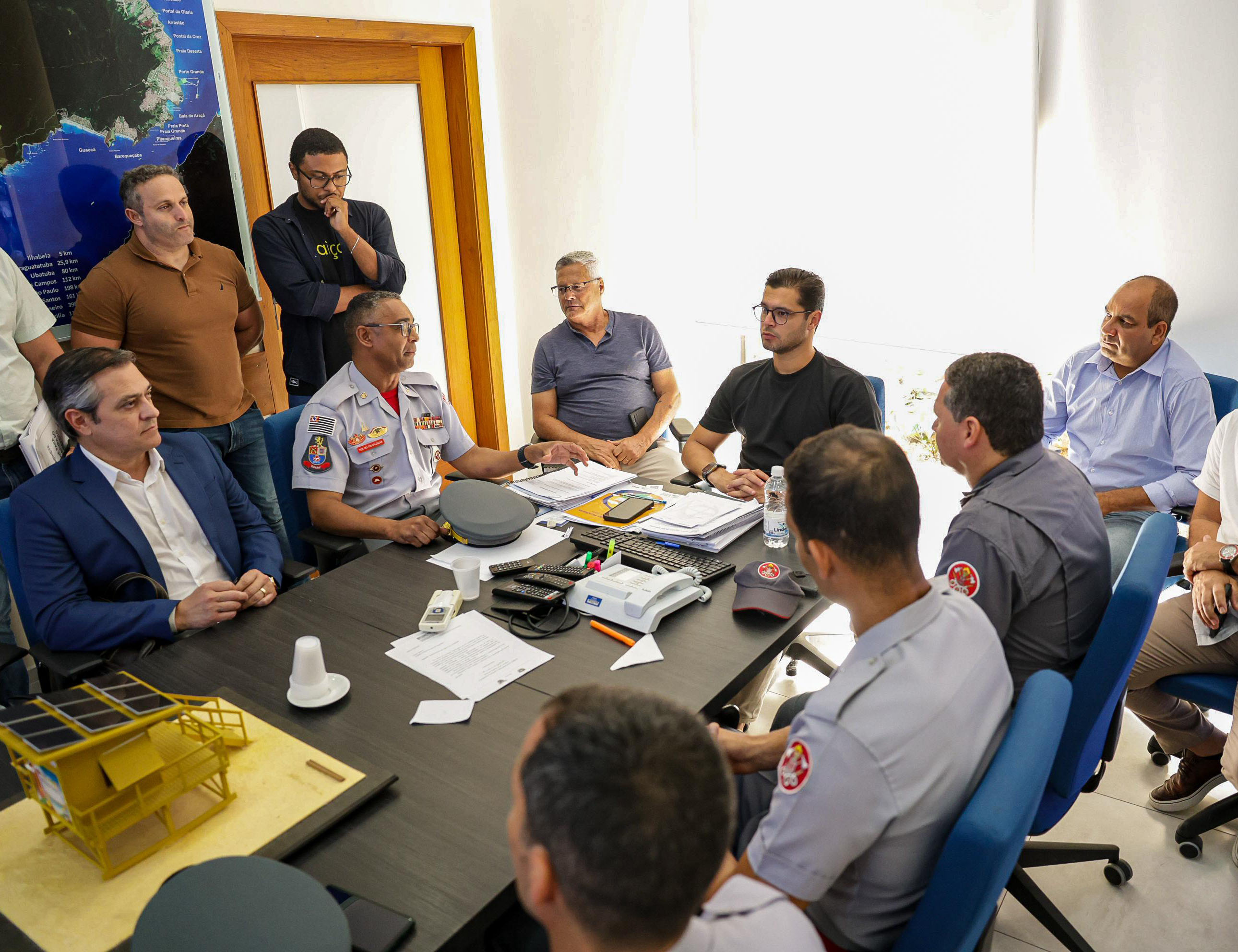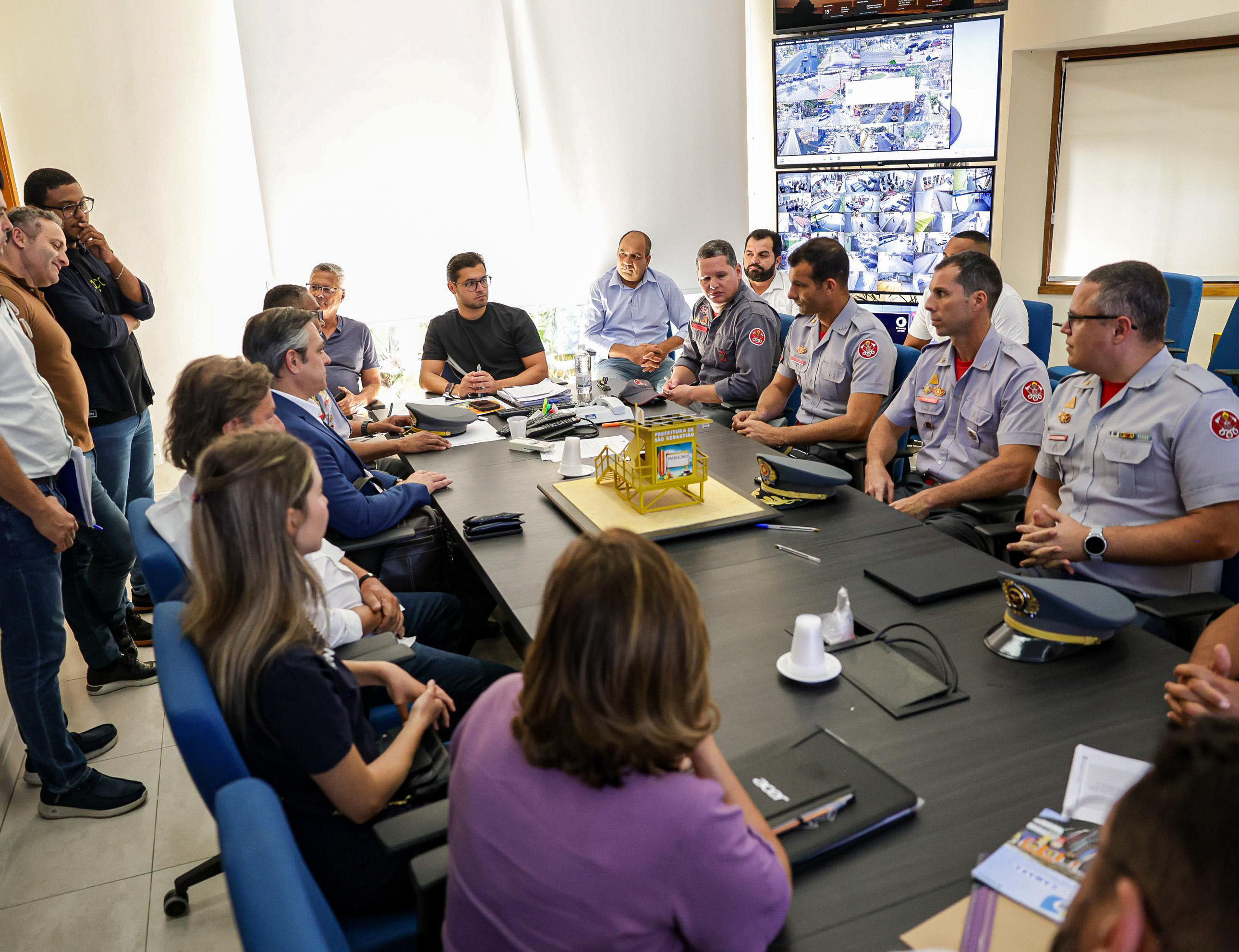 #PraTodosVerem: As imagens mostram uma reunião em uma sala com diversas pessoas sentadas ao redor de uma mesa retangular. Participam do encontro representantes da Prefeitura de São Sebastião, do Corpo de Bombeiros e outros profissionais. Sobre a mesa, há uma maquete de um posto de observação de guarda-vidas, com a inscrição “Prefeitura de São Sebastião” e espaço para patrocínio. A maquete é amarela, elevada com escadas e guarda-corpo. Também estão presentes pastas, documentos, bonés e copos descartáveis. Ao fundo, há um grande mapa na parede e monitores com imagens de câmeras de segurança. O ambiente sugere uma reunião de planejamento estratégico voltada à segurança nas praias.