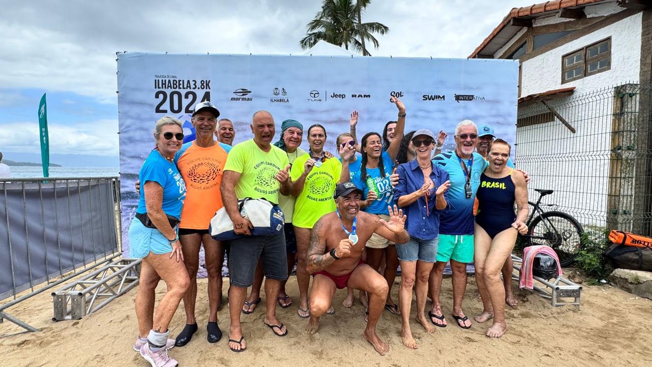 #ParaTodosVerem: imagens da Equipe Cardume de São Sebastião, grupo de natação apoiado pela Prefeitura de São Sebastião, que participou da Travessia do Canal de Ilhabela. Fim da descrição.