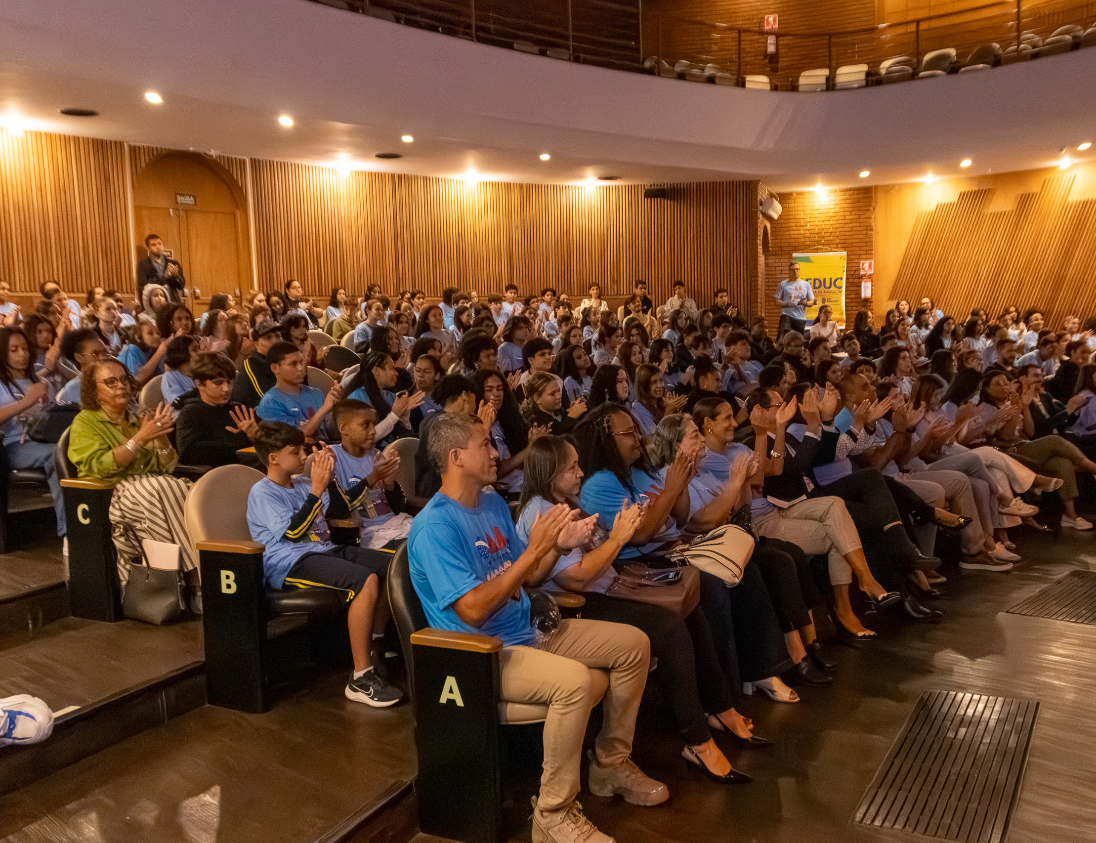 #PraTodosVerem: As imagens documentam o evento de encerramento ou premiação do ‘Projeto OAB Vai à Escola’ e do “Programa Cidadania e Justiça também se aprendem na escola”, realizado em um auditório. As fotos mostram os estudantes, a maioria vestindo camisetas azuis claras, e os organizadores, incluindo advogados, em momentos de celebração: posando no palco com certificados, prestando uma homenagem solene com a mão no peito, e interagindo com uma plateia lotada de jovens aplaudindo e com as mãos levantadas, evidenciando o sucesso do projeto. Fim da descrição.