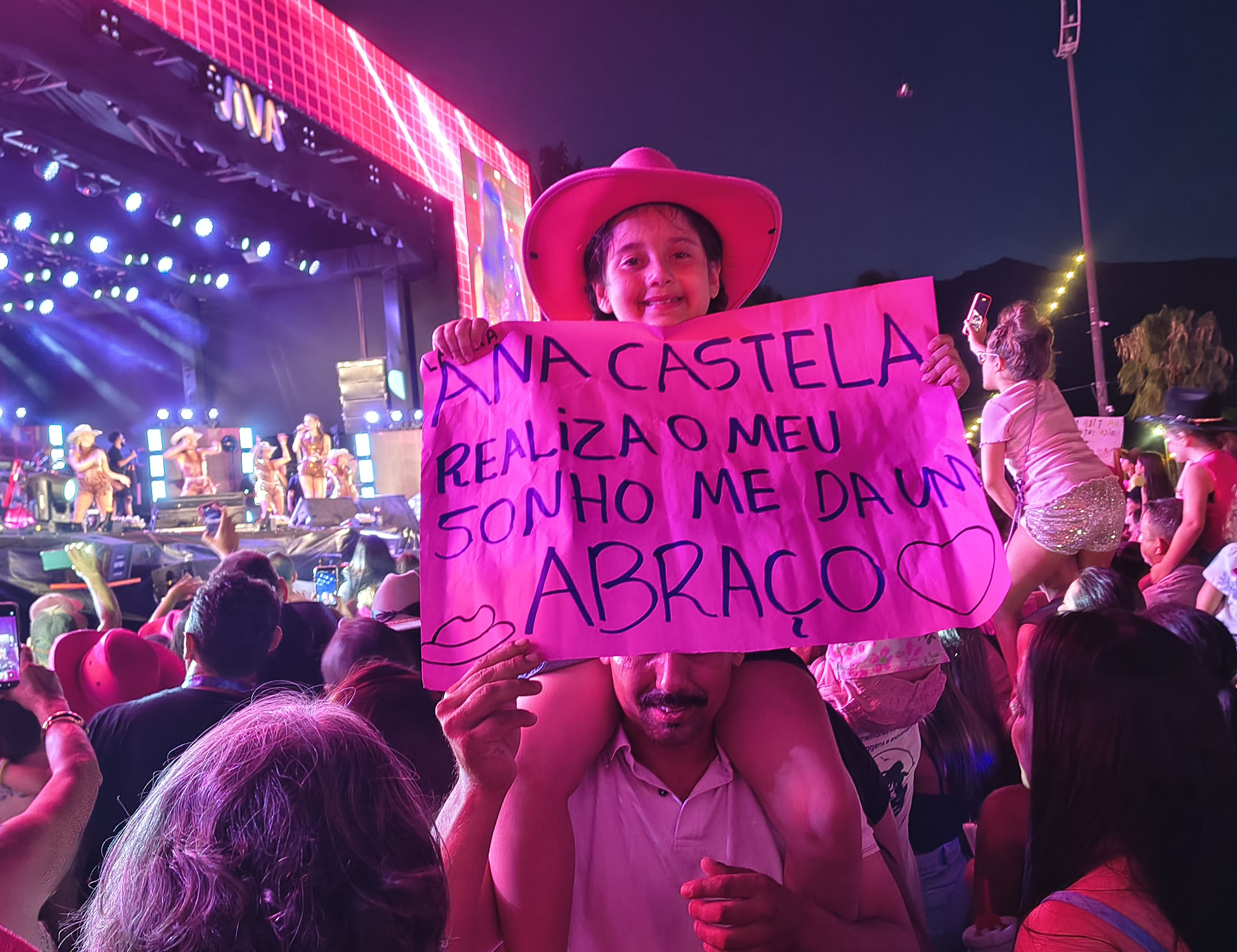 A pequena Laura Pereira dos Santos Maia, de 7 anos, fez os pais saírem de Caraguatatuba logo cedo para não perder o show de sua ídola. Com um cartaz preparado pela mãe, Luana Pereira, e nos ombros do pai, a menina demonstrou todo o carinho por Ana Castela: “Ana Castela, realiza o meu sonho, me dá um abraço”, dizia a mensagem.