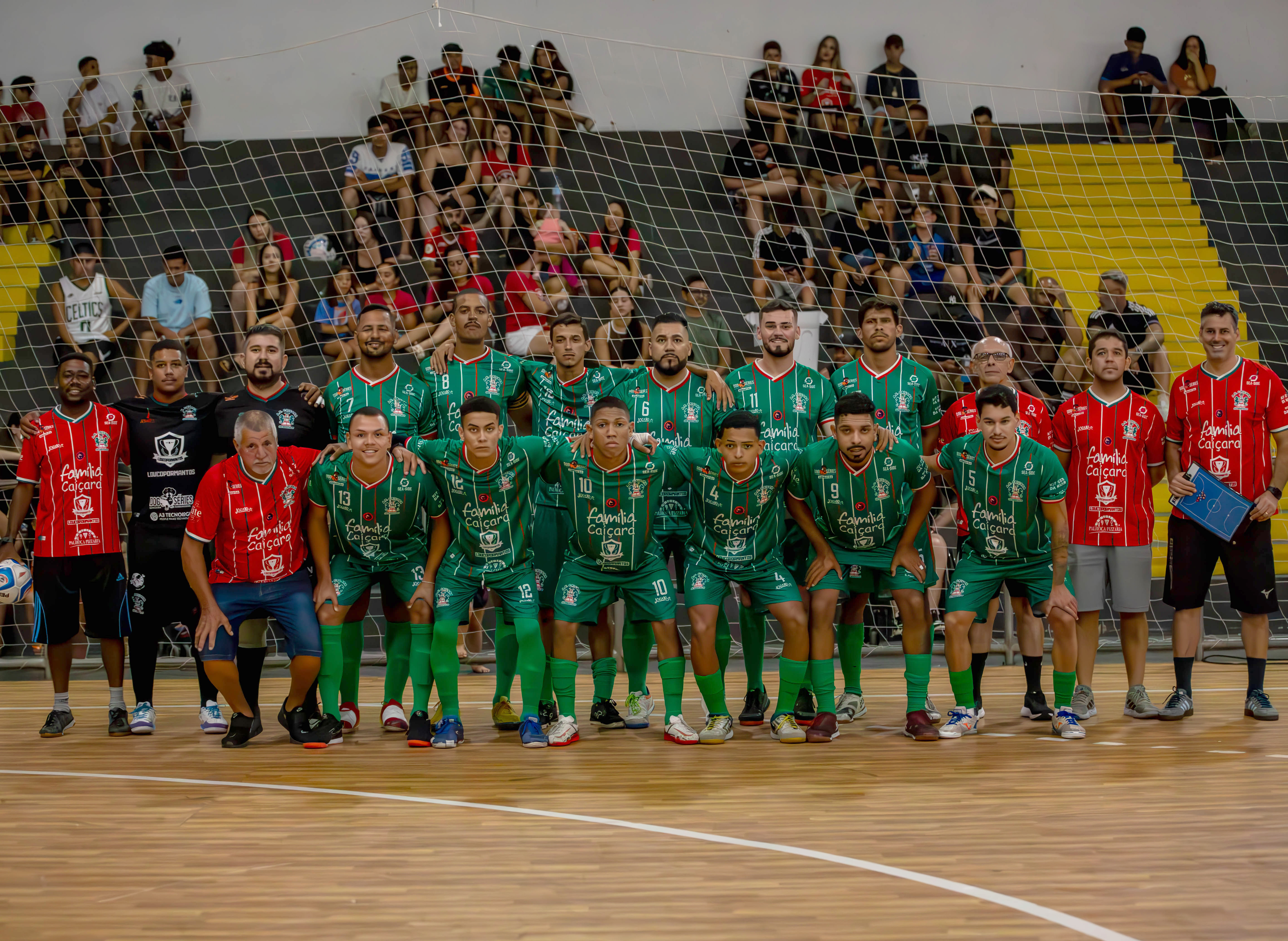 #PraTodosVerem: foto da equipe do Caiçara em quadra, mostrando vários homens usando uniformes de jogo verde e vermelho e outros usando camisas vermelhas de comissão técnica/suporte, alinhados em duas fileiras em frente a uma baliza. Já em outra cena, a equipe Ki-Fogo posa reunida na quadra indoor antes da partida, com dois grupos de jogadores alinhados em duas fileiras, a primeira fileira agachada e a segunda em pé, todos usando uniformes amarelos estampados com detalhes em preto e uma faixa vertical nas cores verde, vermelha e amarela. Fim da descrição.