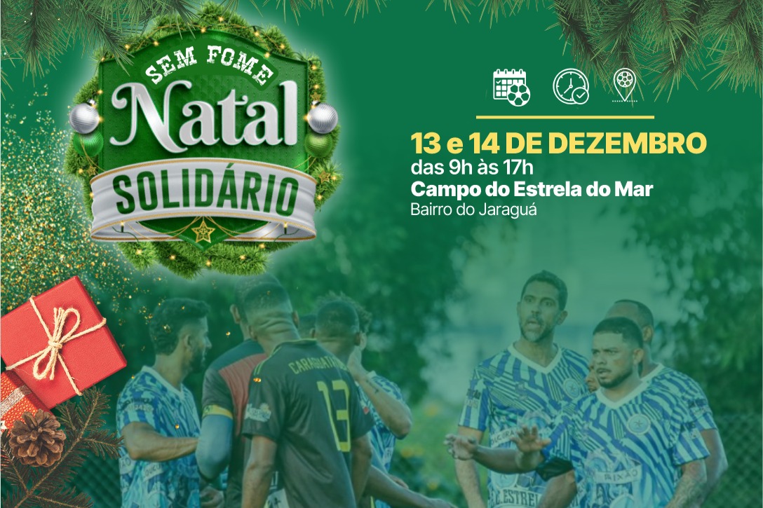 #PraTodosVerem: A primeira imagem é um cartaz verde com temática natalina para o evento "Natal Solidário Sem Fome", que ocorrerá nos dias 13 e 14 de dezembro, das 9h às 17h, no Campo do Estrela do Mar, Bairro do Jaraguá, e mostra jogadores de futebol reunidos na parte inferior. A segunda imagem é uma foto do Campo do Estrela do Mar, um campo de futebol gramado com marcações brancas, uma trave ao centro e cercado por vegetação e morros ao fundo. Fim da descrição.