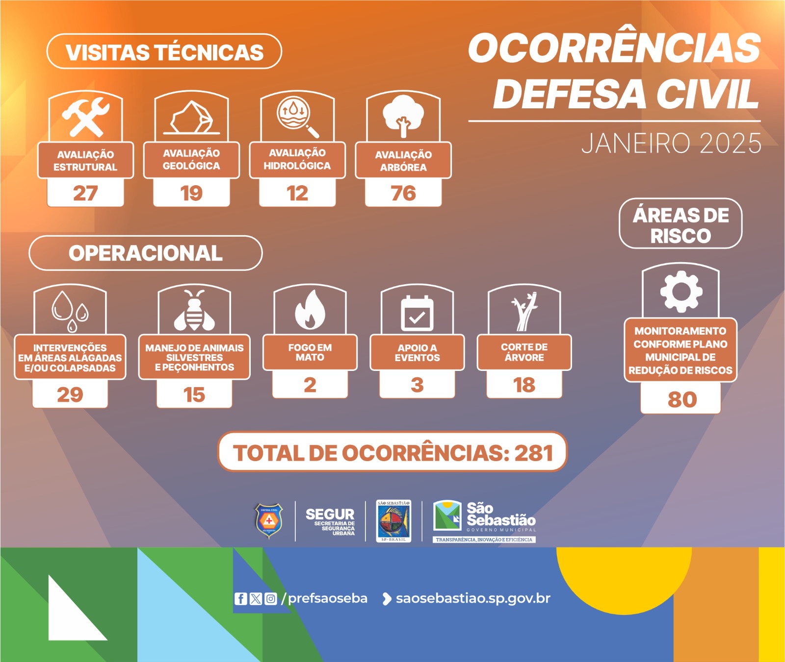 Balanço da Defesa Civil de São Sebastião aponta que somente no mês de janeiros foram realizados 281 atendimentos dos mais variados. Somente em visitas técnicas foram 134 ações.