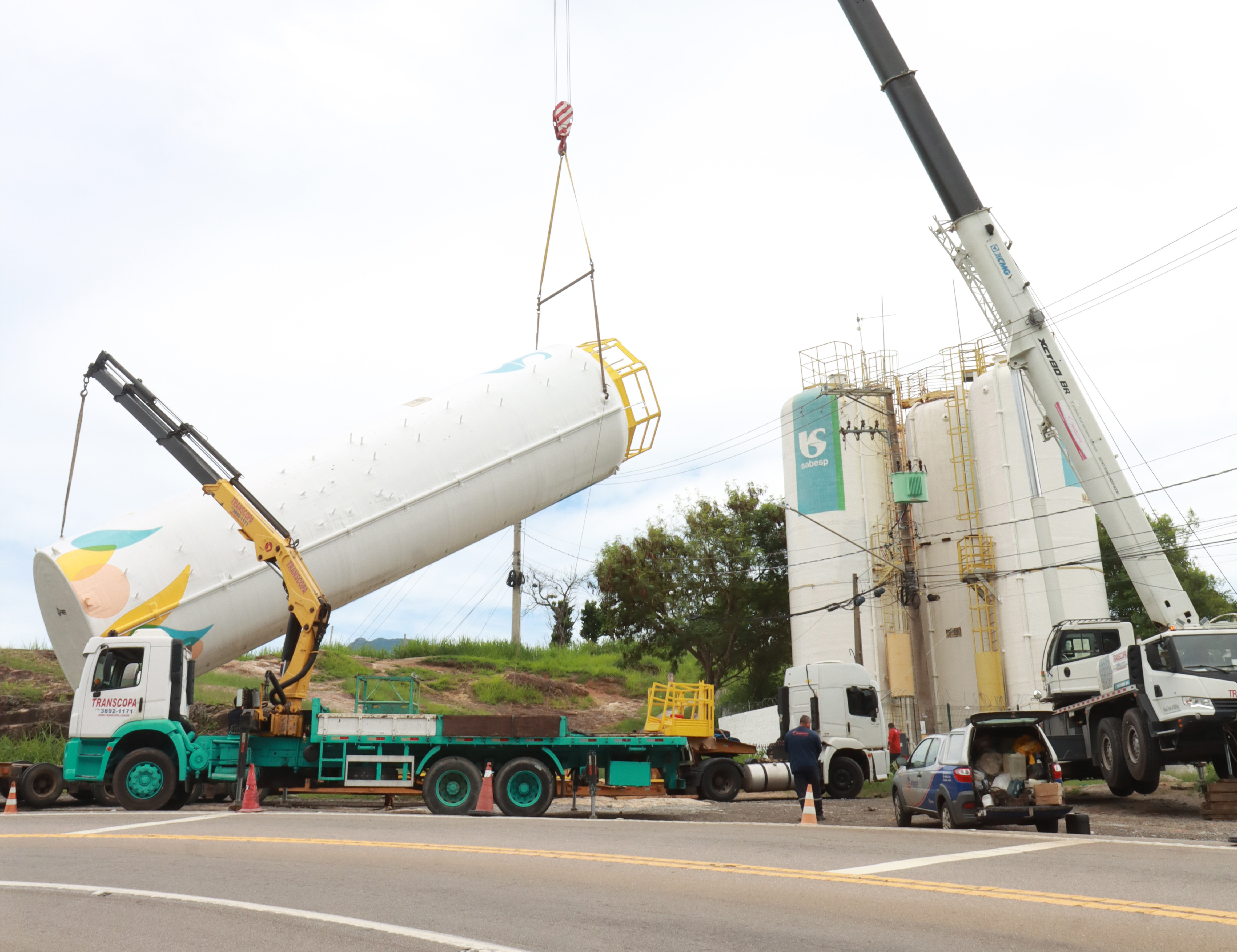 #PraTodosVerem: Sequência de três fotos registra a instalação de um grande reservatório metálico cilíndrico branco da Sabesp em uma área de encosta. Nas imagens, guindastes e caminhões articulados operam às margens de uma rodovia sinuosa para erguer a estrutura, que possui detalhes coloridos na base e uma escada amarela no topo. O cenário é composto por vegetação densa de Mata Atlântica sob um céu nublado, destacando o trabalho de engenharia para o abastecimento de água na região. Fim da descrição.