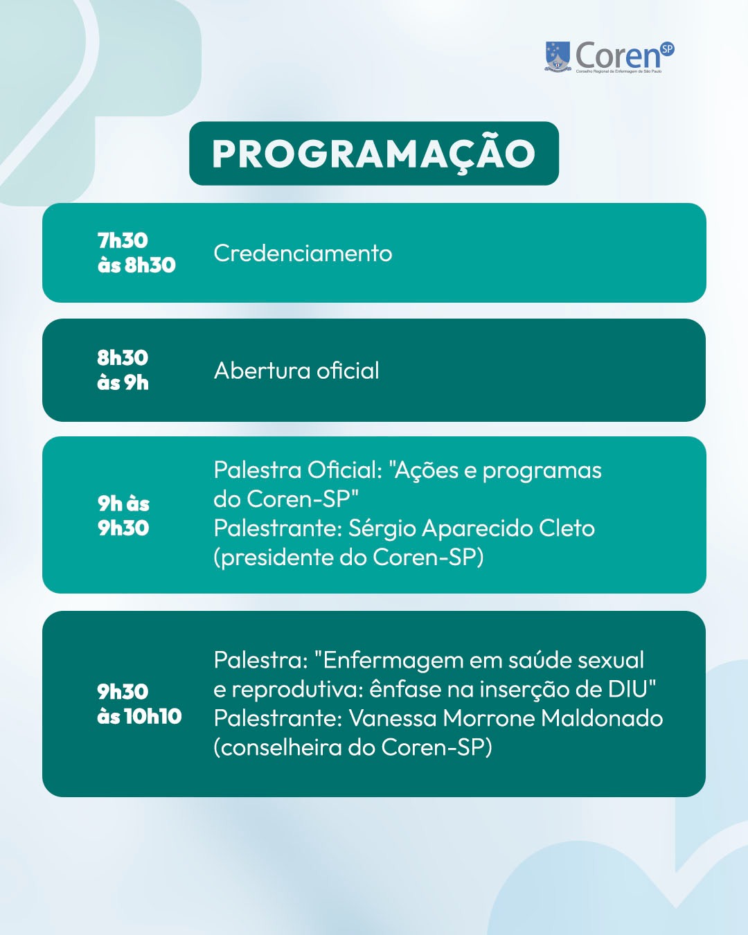 A programação, que ocorrerá das 7h30 às 12h10, inclui palestras sobre temas essenciais para a profissão, como liderança, saúde sexual e reprodutiva, e as novas diretrizes do processo de enfermagem, além de uma apresentação especial sobre as ações e programas do Coren-SP.