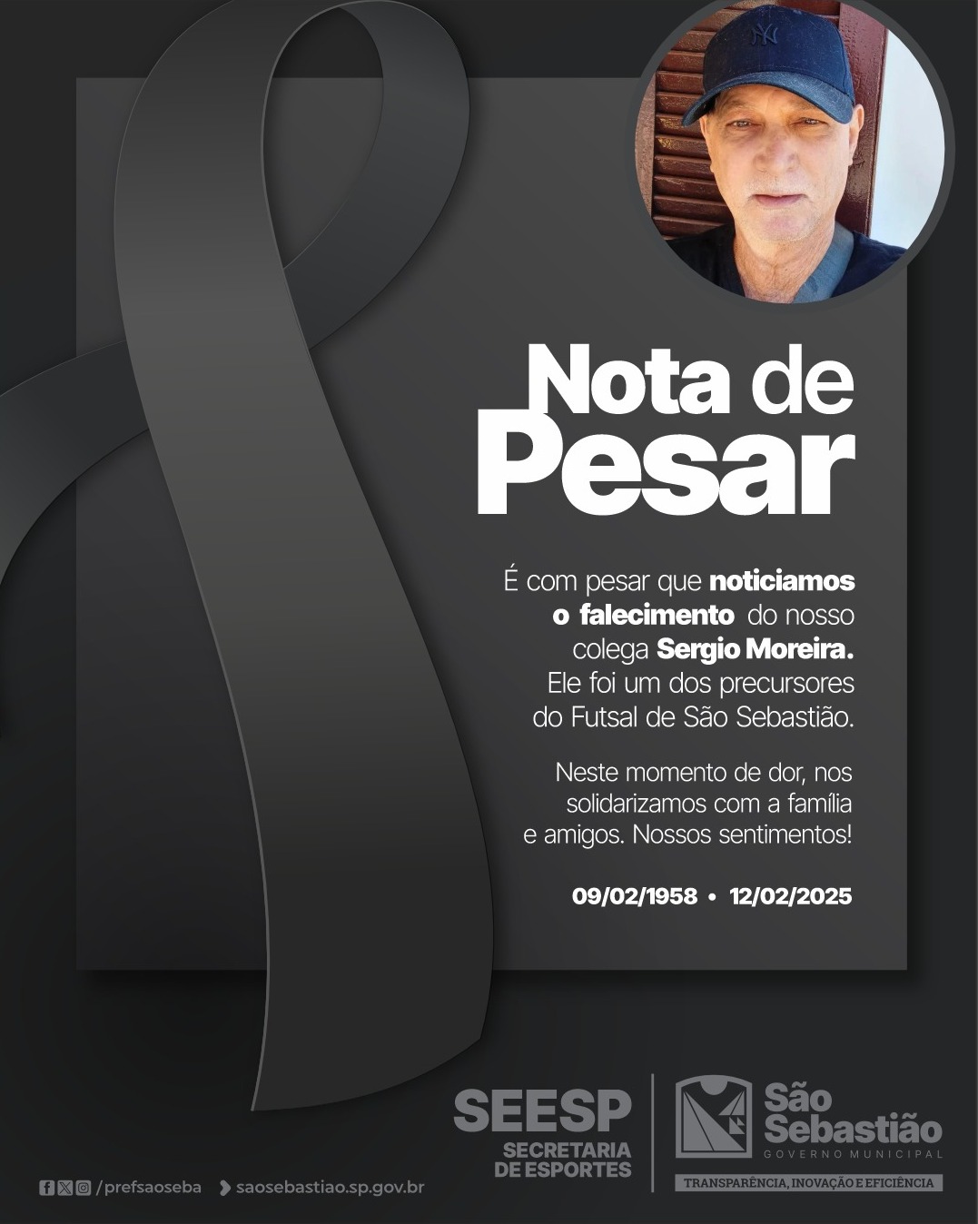 A Prefeitura de São Sebastião, por meio da Secretaria de Esportes (Seesp), lamenta o falecimento de um dos maiores precursores do futsal sebastianense, Sérgio Moreira, na última quarta-feira (12). Sérgio morreu aos 67 anos, três dias depois de comemorar o aniversário dele.