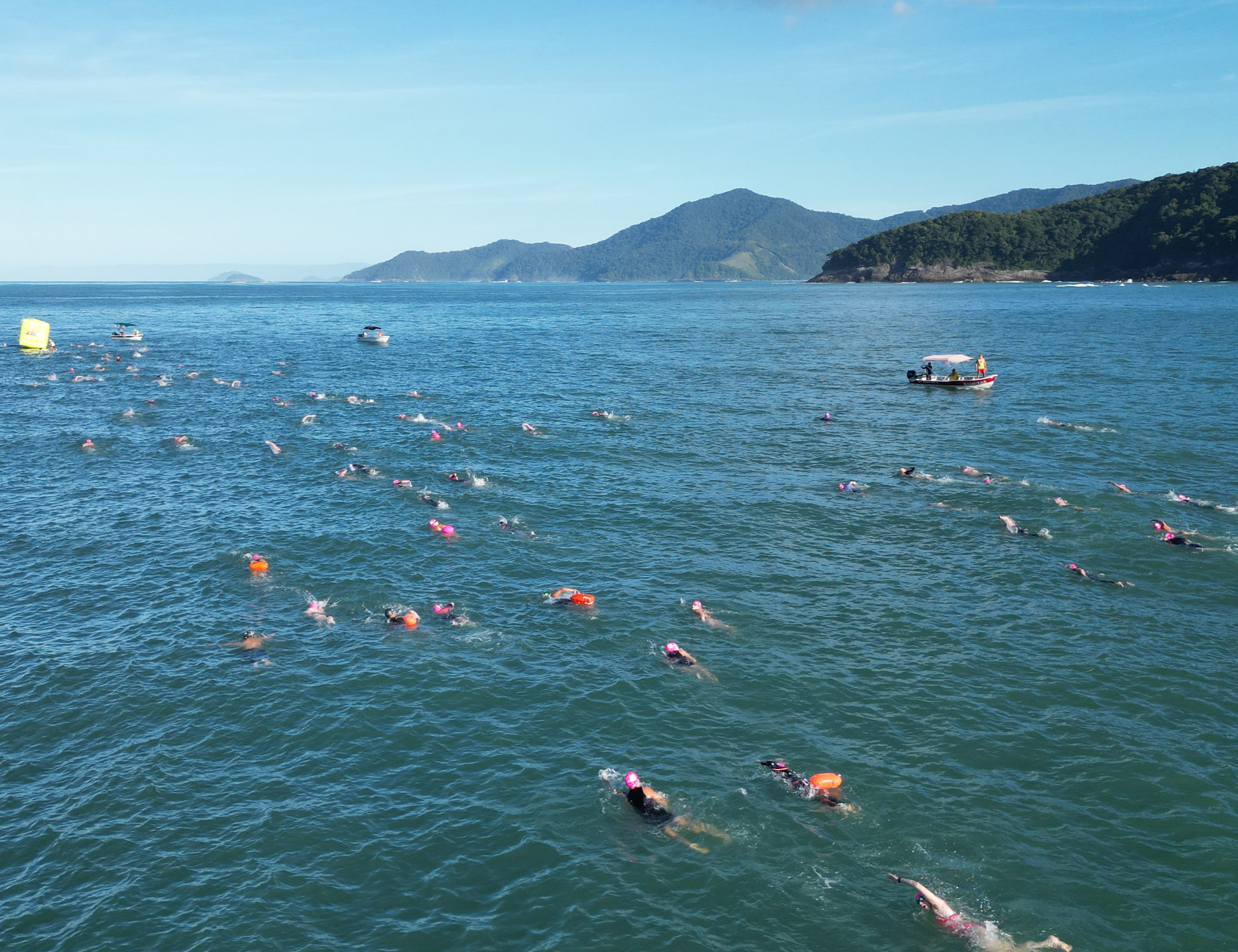 #PraTodosVerem: imagens de atletas participando da tradicional 2ª etapa do Circuito Mares 2026, que reuniu cerca de 3 mil atletas em provas de Maratona Aquática, Aquathlon e corrida. Fim da descrição.