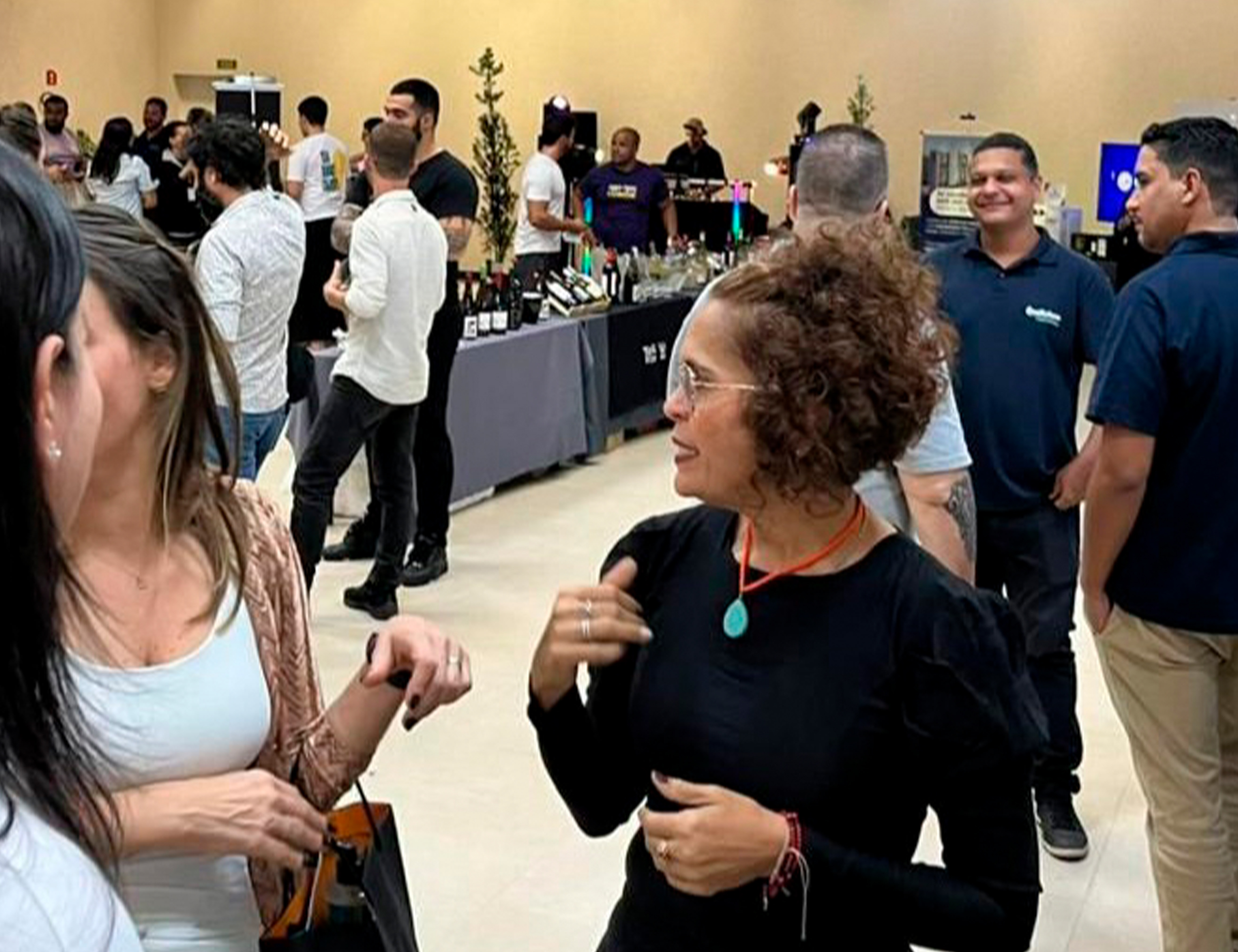 #PraTodosVerem: Em um ambiente descontraído e colaborativo, pessoas participam de palestras e momentos de networking, reunindo-se em mesas para acompanhar apresentações e trocar experiências na última edição do Feirão de Negócios de Maresias e Café Empresarial. Em outro espaço, visitantes circulam entre estandes com exposição de bebidas e produtos, conversando em pequenos grupos e fortalecendo conexões, em um clima de interação e troca de ideias. Fim da descrição.