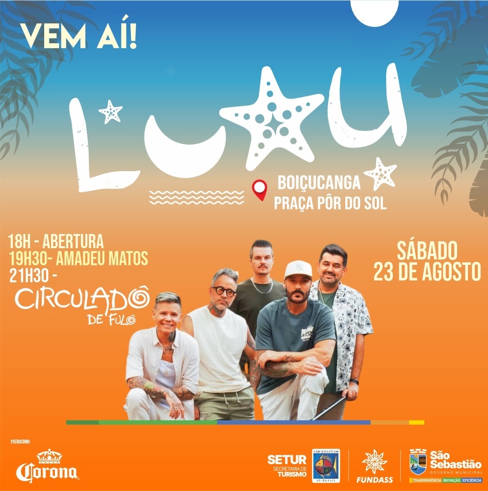 #PraTodosVerem: Card digital com fundo em degradê azul e laranja, com o título “Luau” e ícones de estrela e concha. Ao centro, foto do grupo Circuladô de Fulô, cinco homens posando em ambiente externo com plantas. Texto informa: “Boiçucanga – Praça Pôr do Sol. Sábado, 23 de agosto. 18h – Abertura, 19h30 – Amadeu Matos, 21h30 – Circuladô de Fulô”. Logomarcas da Corona, Setur, Fundass e Prefeitura de São Sebastião na parte inferior. Fim da descrição.