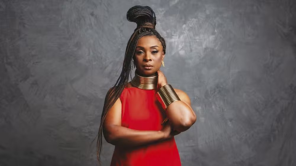 #PraTodosVerem: Imagem da escritora Eliane Marques em pé, usando um vestido vermelho, braceletes e colares dourados. Ela é uma mulher negra, tem tranças longas e está com uma delas presa no alto da cabeça. O fundo é cinza. A outra imagem mostra a fachada da Biblioteca e Videoteca Municipal de São Sebastião. O prédio é composto por duas partes: uma branca com o nome “Biblioteca Municipal” e o logo da Fundass, e outra amarela com o nome “Videoteca Municipal” em letras grandes. O céu está azul e o dia ensolarado. Fim da descrição.